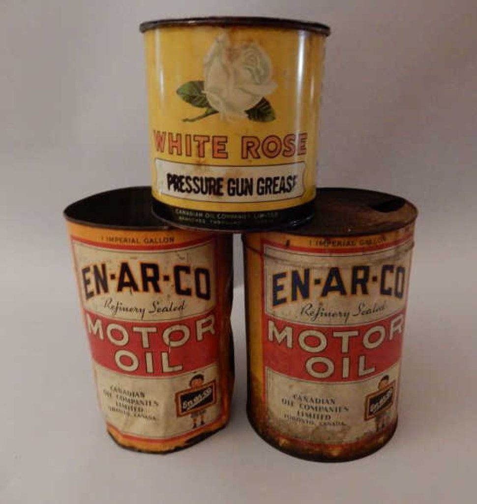 2 EN-AR-CO IMP. GAL. CANS - BOTH SHOW WEAR - 1 HAS NO TOP WHITE ROSE 5 LB. GREASE- SOME CONTENT SOME WEAR