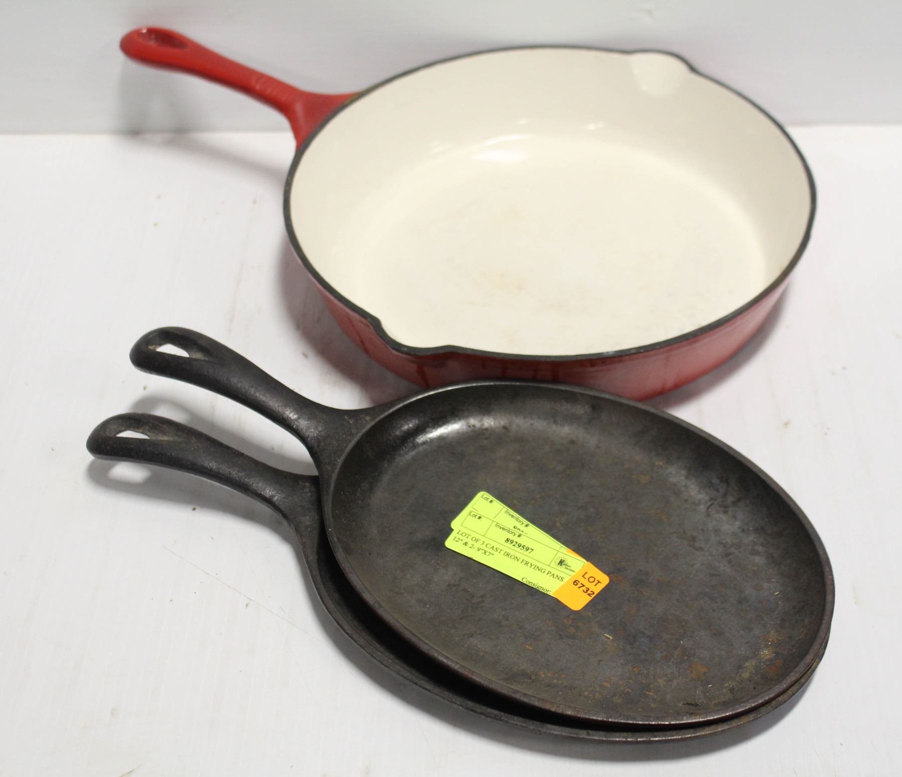 LOT OF 3 CAST IRON FRYING PANS 12" & 2- 9"X7"