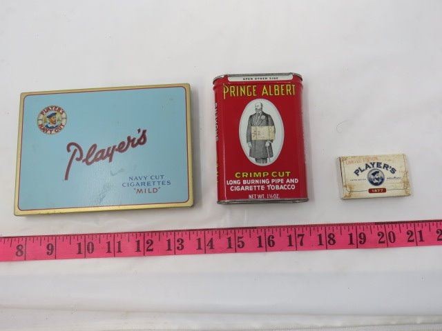 LOT OF 3 CIGARETTE ITEMS (2 X TINS, PRINCE ALBERT, PLAYERS) *WOOD MATCHES*