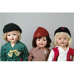 Lot # 285 LOT OF 3 COMPOSITION DOLLS. 1) 28", "Campfire Girl". Pale blonde clipped wig, blue sleep eyes, painted molded features, original costume with two pins. "EC" on rear of head. CONDITION: Good to near excellent. 2) 26", "Brownie", brown saran wig, eyes crazed, painted and molded features, in original brown uniform and beanie. No mark. CONDITION: Near excellent. 3) 29", "Girl Scout", original blonde wig, blue sleep eyes, dressed in original Girl Scout uniform with tan skirt scarf and pin. CONDITION: Near excellent. 1-28685 (LS) (175-300)