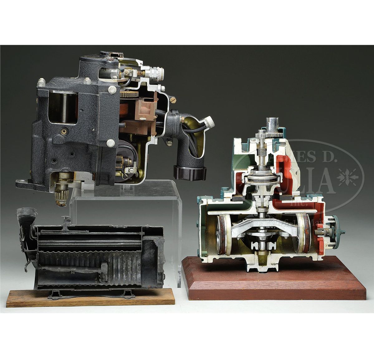 Three elaborate engines with a series of gears and valves with the casings partially cut away to show the inner mechanics in order for the salesman to educate the potential client. SIZE: Largest 10" l x 12-1/2" h. CONDITION: Overall very good to excellent with some deterioration of more sensitive components. 1-13565
