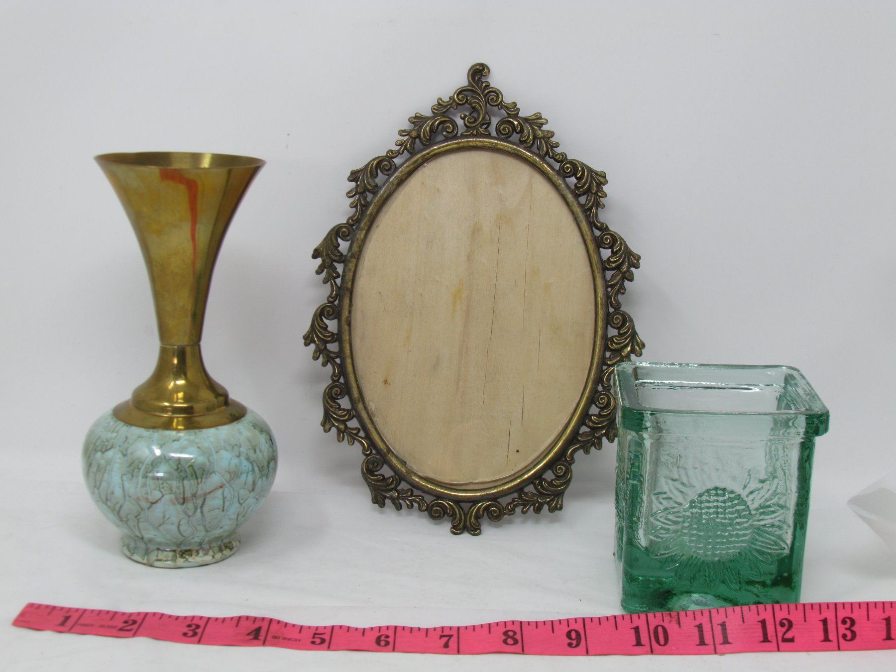 LOT OF 3 DECORATIVE HOUSEHOLD ITEMS (PICTURE FRAME, VASE, SQUARE GLASS JAR)
