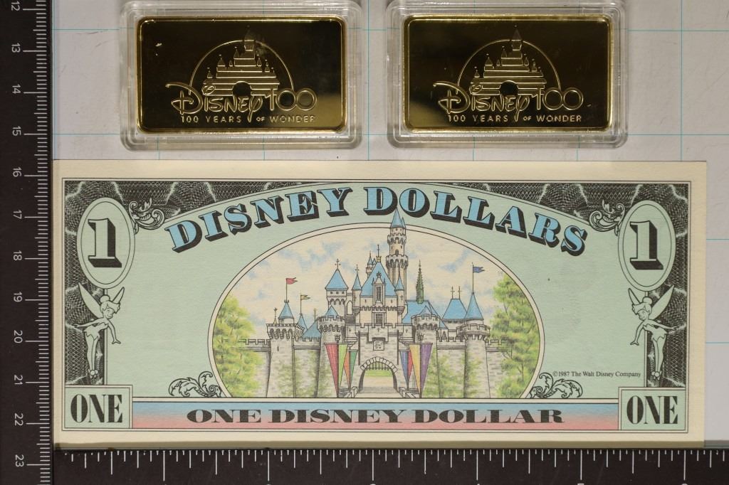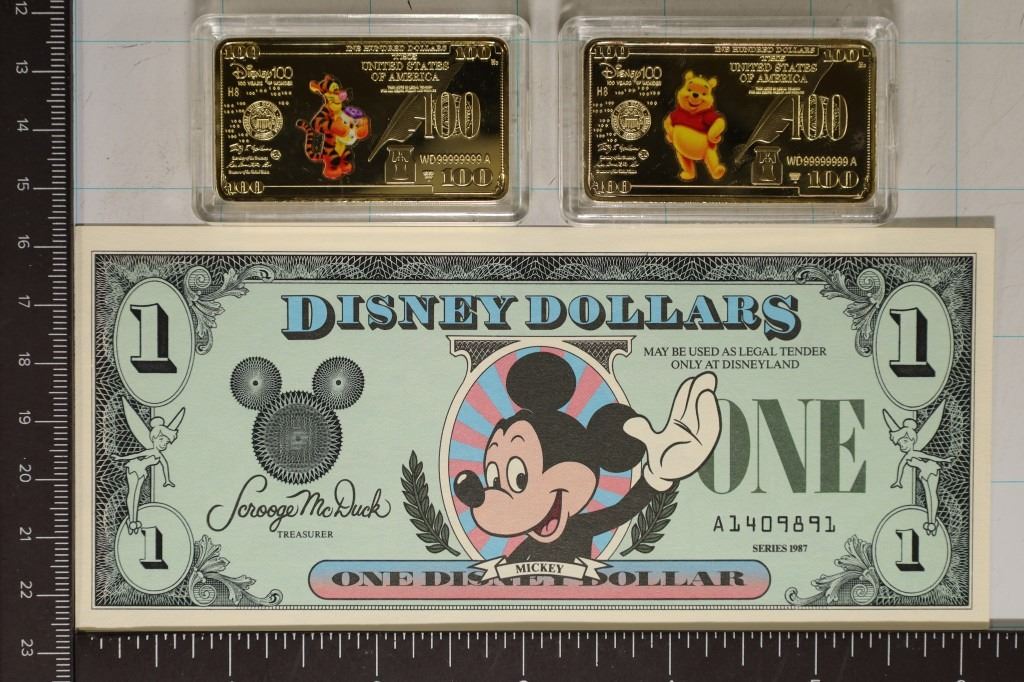 COLORIZED CRISP UNC, 2-1 OZ. GILDED WINNIE THE POO AND TIGER BARS. BOTH ARE REPLICAS OF $100, IN HARD PLASTIC CAPSULES