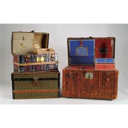 LOT OF 3 DOLL TRUNKS. Includes two dome top trunks, one covered in paper litho, the other covered in leather. Both with wood straps and metal highlights. Also included is a flat top tin covered trunk with wood straps filled with a variety of doll clothes and dresses. SIZE: Largest is 18" l. x 10" h. CONDITION: Overall fair to good. 1-2451-1103