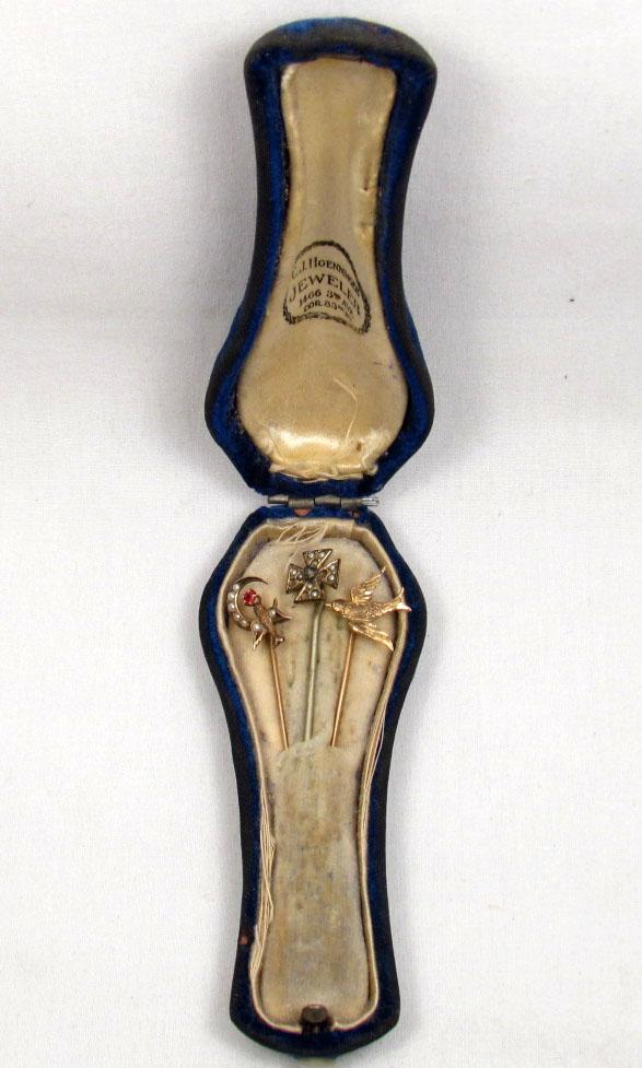 LOT OF 3 EARLY STICK PINS IN ORIGINAL VELVET CASE