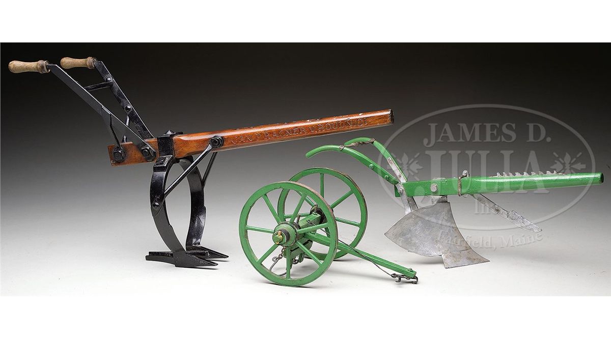 Lot includes unusual plow with wooden post supporting a curved iron arraignment rather than the standard plow blade shape stamped "Jan P Racner V. P. Oudnici" on one side and "Patent Cislo 32267" on the other. Also includes wood and steel plow and two wheeled wagon front with steel slips. SIZE: Largest is 19" l x 10-1/2" h. PROVENANCE: The late Terry Wesner collection, Chelsea, Michigan. CONDITION: First plow appears to be very good to excellent, other two pieces have been repainted. 1-13516