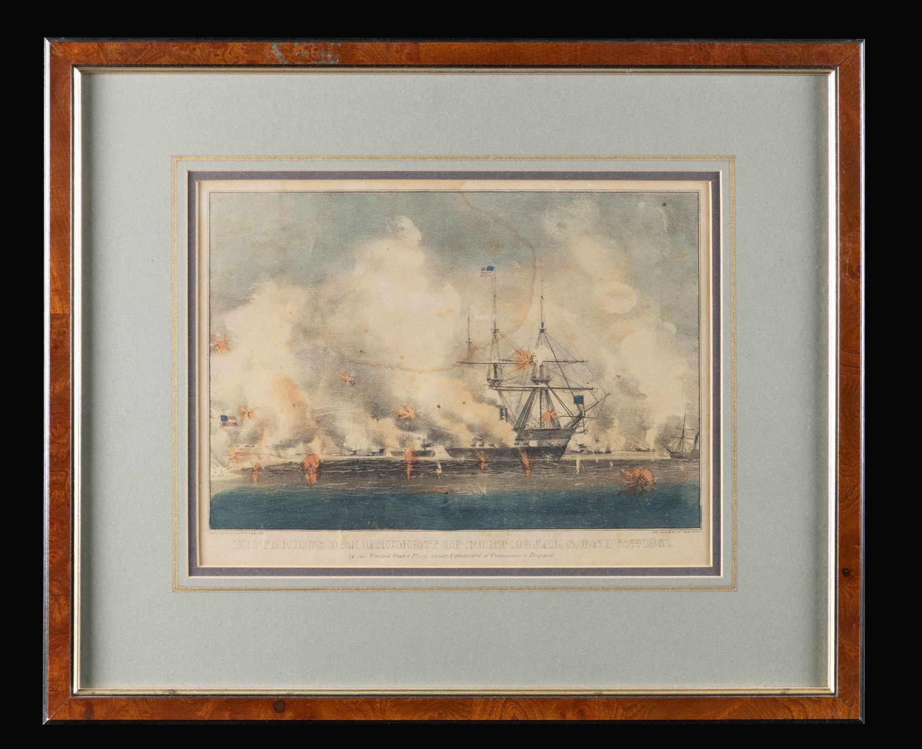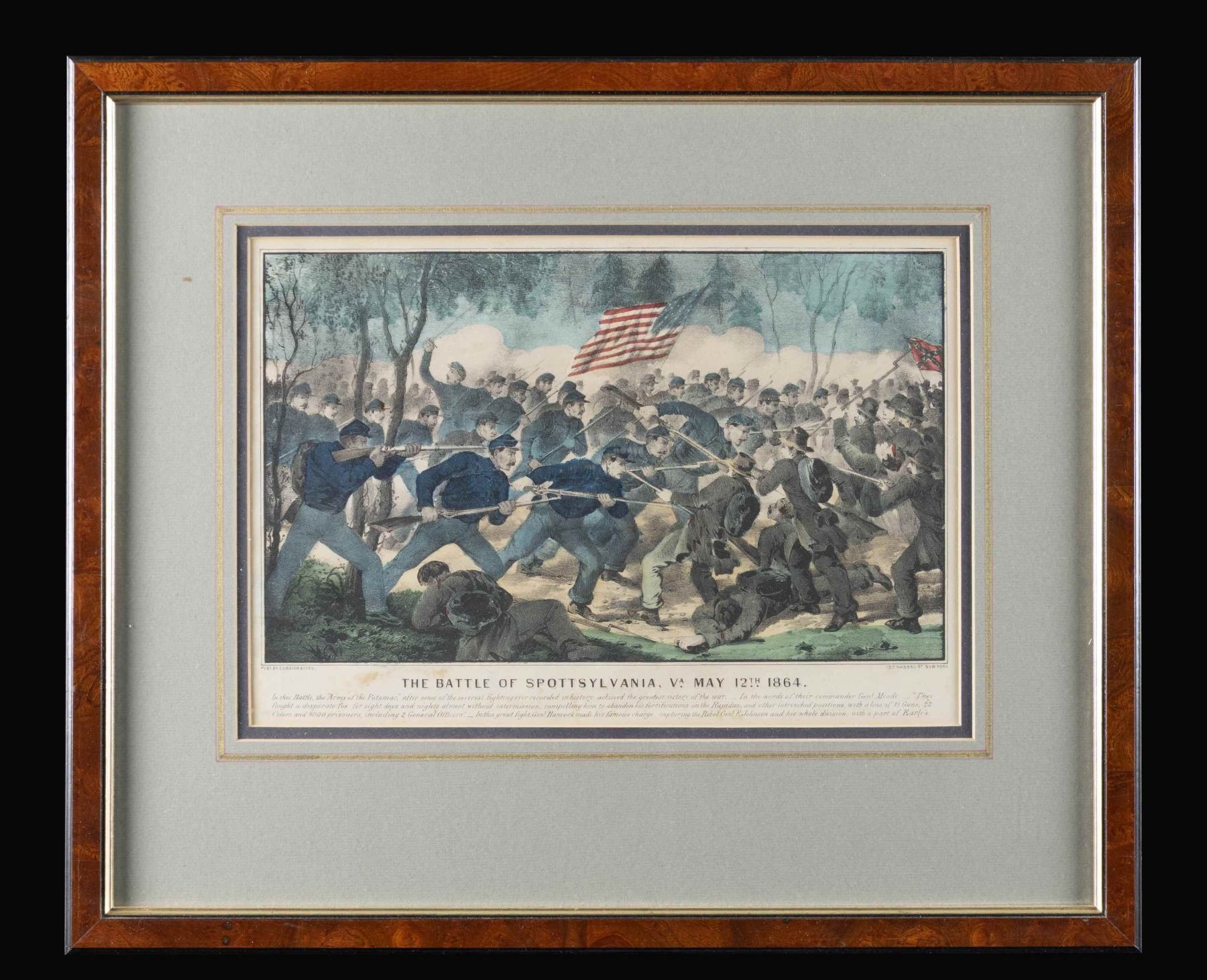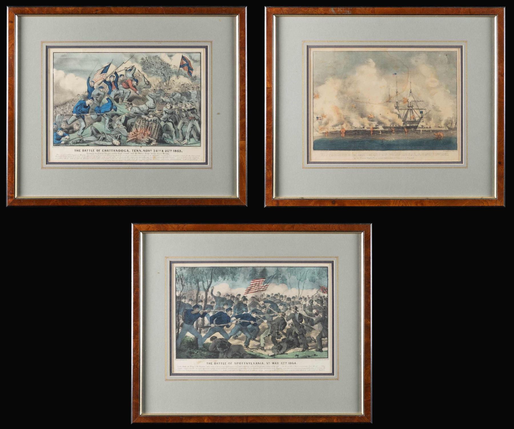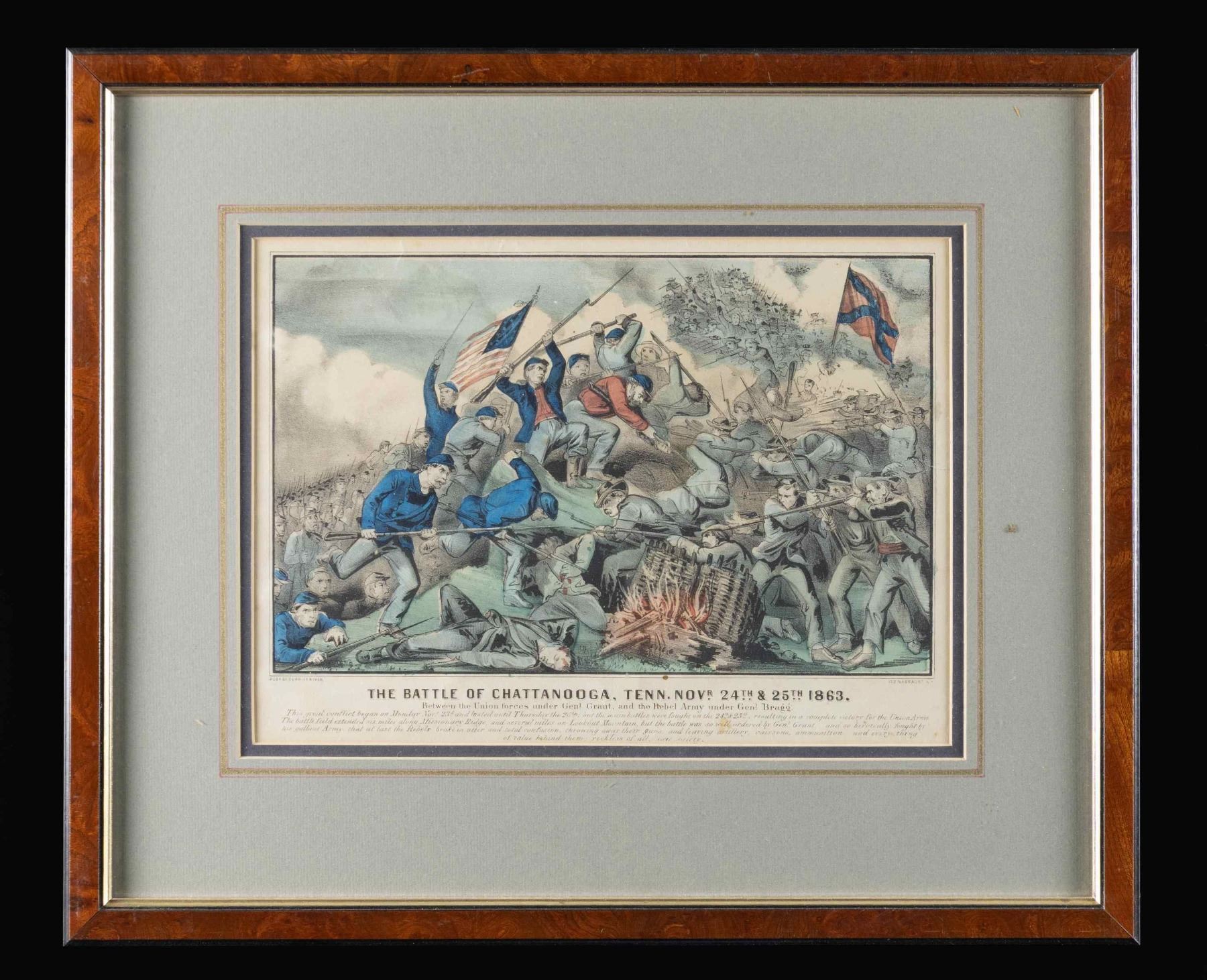 FRAMED PRINT OF CONFEDERATE GENERAL ROBERT E. LEE. 1) Lot of 3 framed Currier & Ives Civil War prints, including: 1) "THE BATTLE OF SPOTTSYLVANIA, VA. MAY 12TH 1864". 2) "THE BATTLE OF CHATTANOOGA, TENN. NOVR. 24TH & 25TH 1863.". 3) "VICTORIOUS BOMBARDMENT OF PORT ROYAL, S.C. NOV. 7TH 1861.". Prints are professionally framed and matted by Ann Getsinger of Mill River, MA. CONDITION: very good, with few spots of light superficial wear. (02-25545/MLW). 2) Framed black & white portrait of Confederate General Robert E. Lee. Print is professionally framed and matted by Ann Getsinger of Mill River, MA., with a label on the rear reading "Reproduction from the/ Collections of the/ LIBRARY OF CONGRESS". CONDITION: very good, with few spots of light superficial wear. (02-25545/MLW). NON-GUN. $600-1,000.