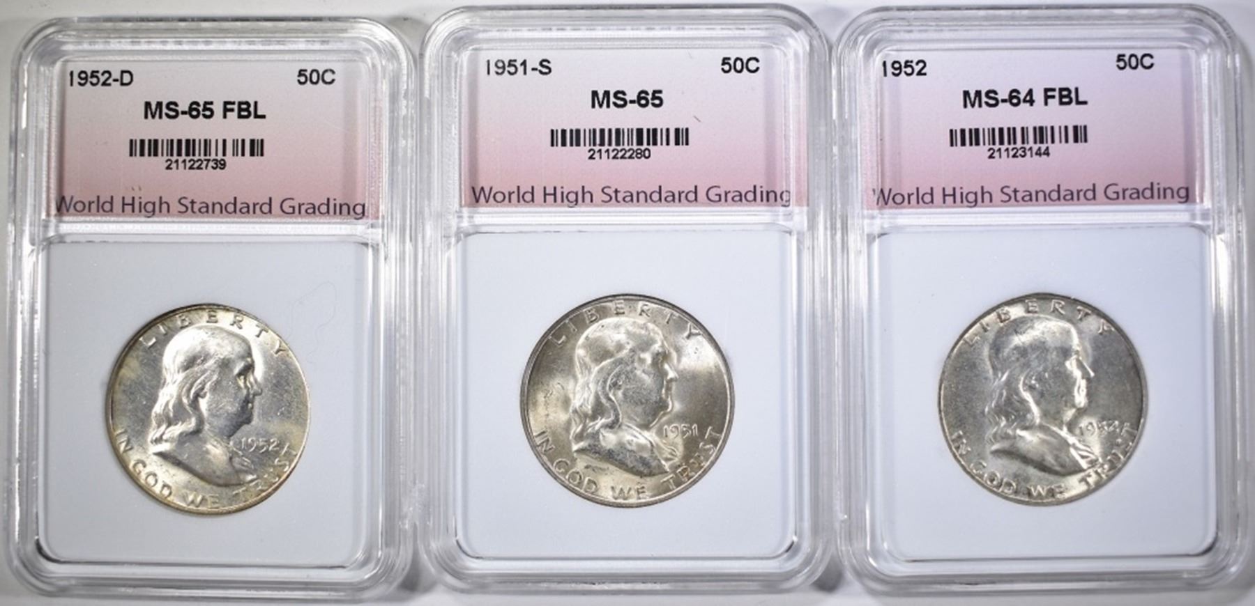 1951-S WHSG GEM BU, 1952 WHSG CH/GEM BU FBL & 1952-D WHSG GEM BU FBL. ESTIMATE $200 - $250.