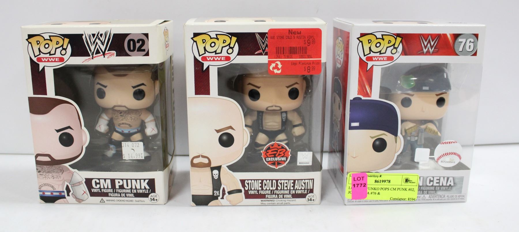 LOT OF 3 FUNKO POPS CM PUNK #02, JOHN CENA #76 &