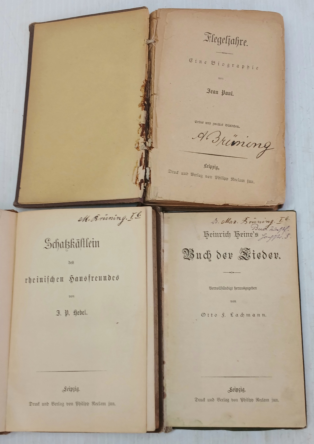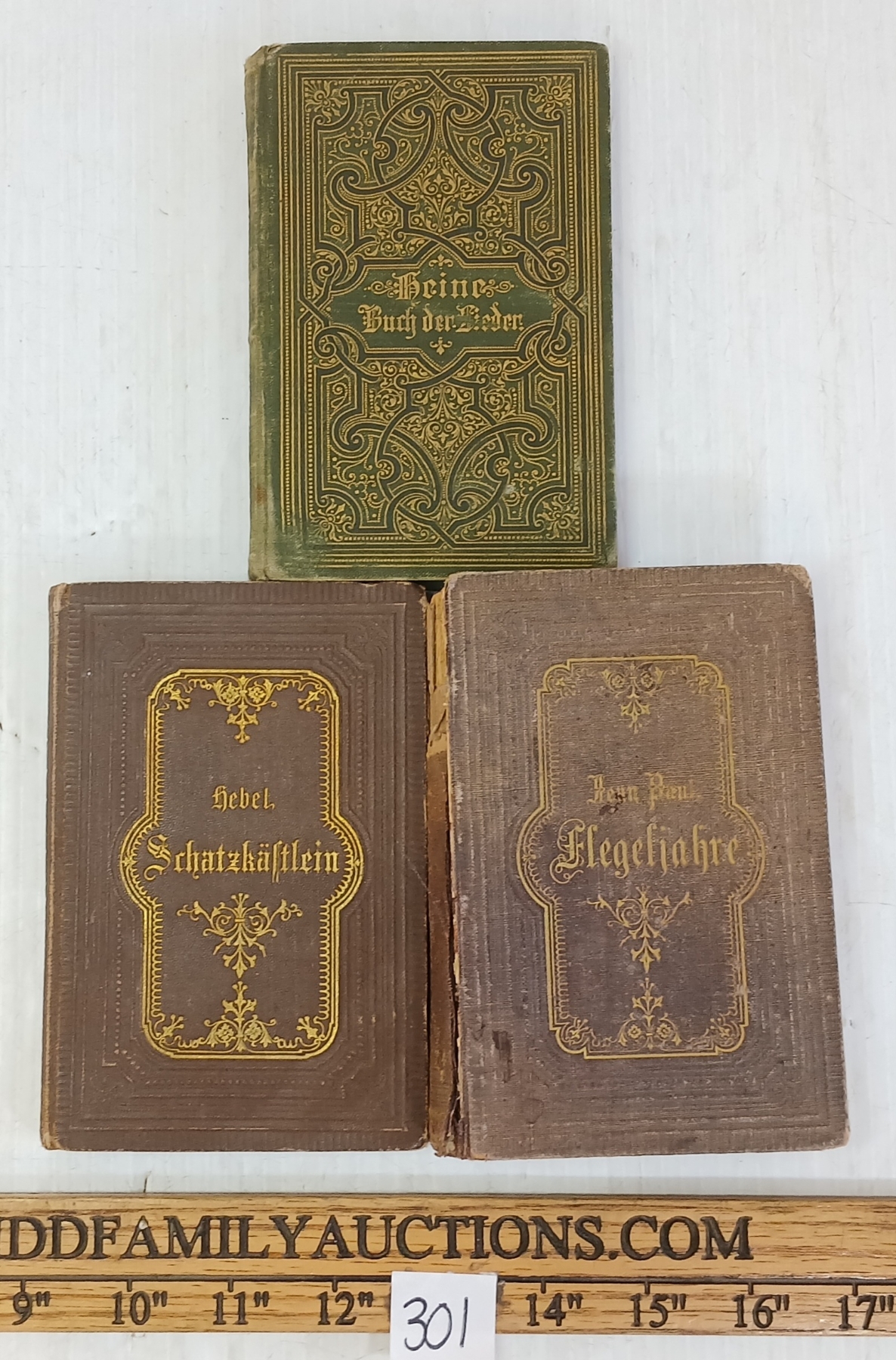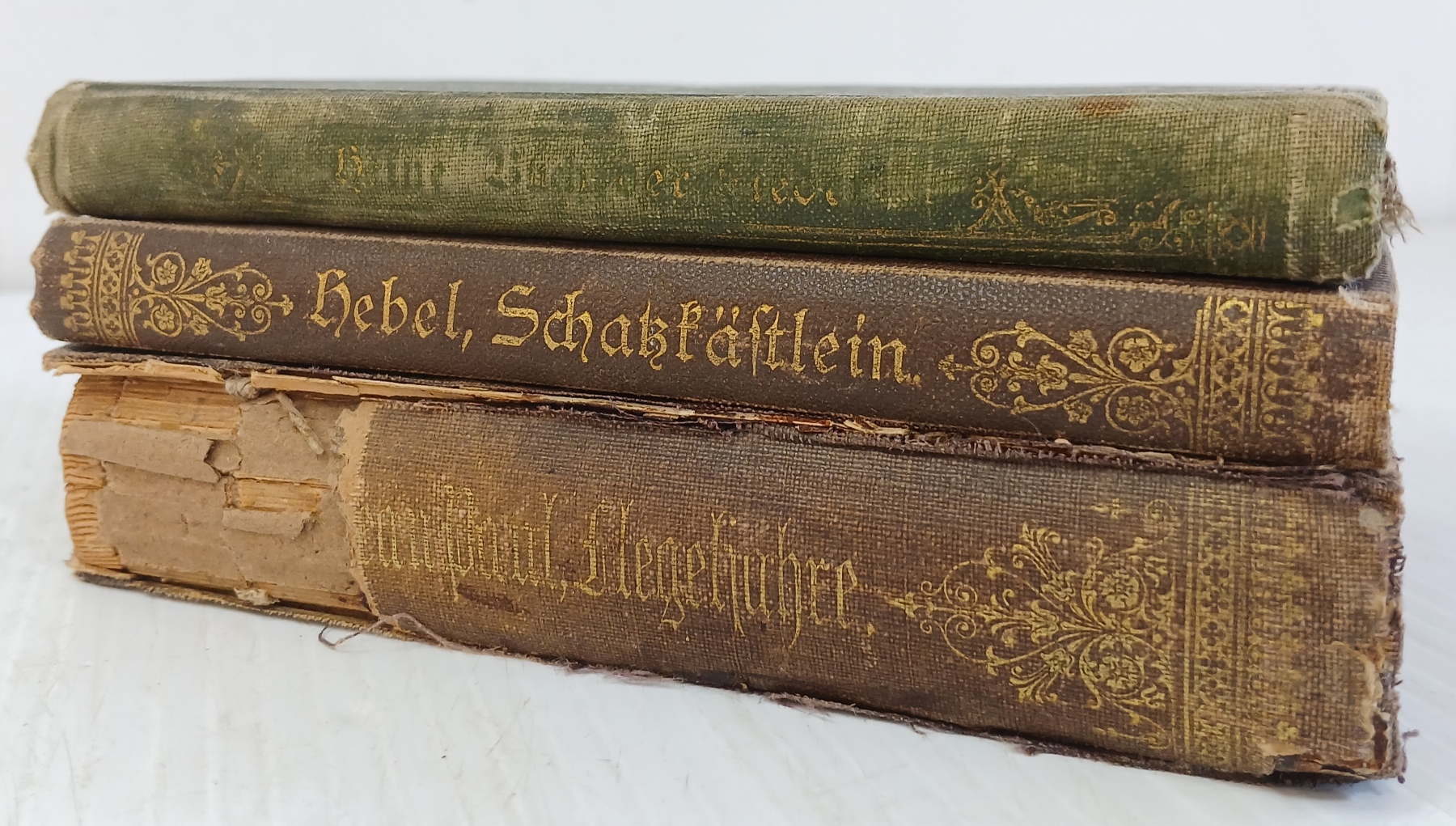 NOTE: HARDCOVERS - 1 GILDED EDGED - "BOOK OF SONGS", "FLEGELIJAHRE: A BIOGRPAPHY" & "TREASURE CHEST OF THE RHENISH HOUSE FRIEND"- AUTHORS INCL HEINRICH HEINE, JEAN PAUL & JOHANN PETER HEBEL