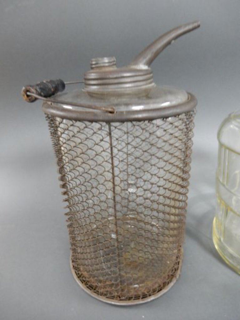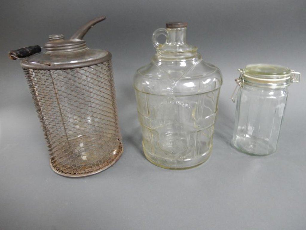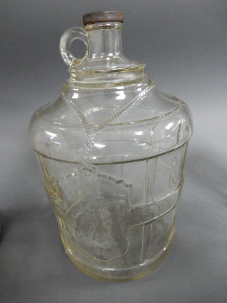 LOT OF 3 GLASS WEAR COLLECTIBLES BRIGHT'S WINE ONE GAL. JAR- ORIGINAL CAP- GLASS IN MESH DISPENSER- CORRECT CAP & SPOUT- STORE JAR LOCATION: LOWER LEFT