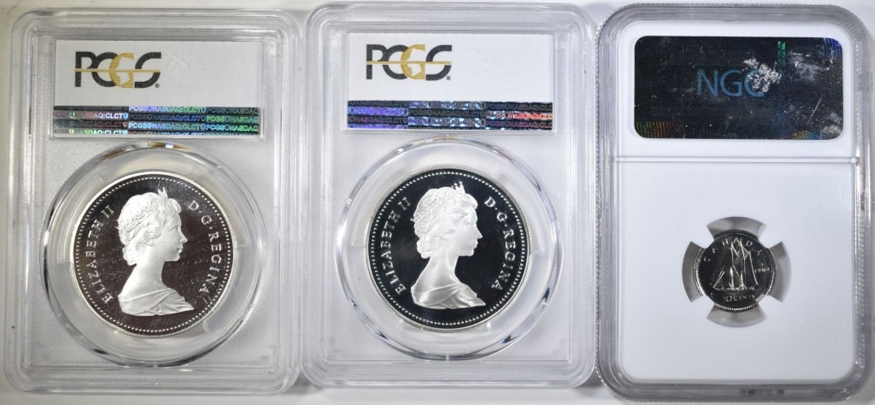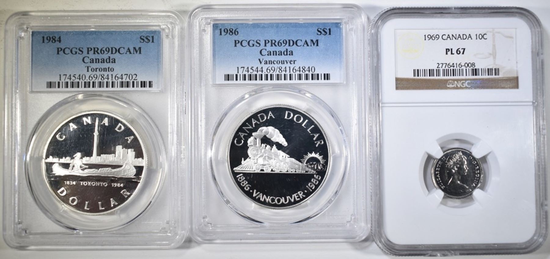 1969 10 CENTS NGC PL-67, 1984 TORONTO SILVER DOLLAR PCGS PR-69 DCAM & 1986 VANCOUVER SILVER DOLLAR PCGS PR-69 DCAM. ESTIMATE $150 - $175.