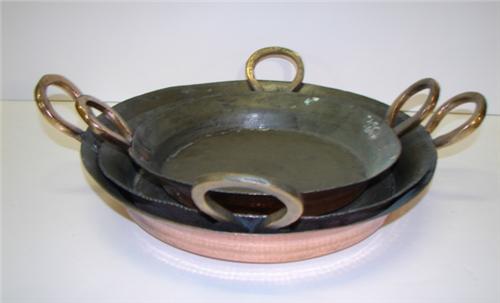 LOT OF 3 HAMMERED COPPER PANS. Double handled. Largest: 13” Dia.