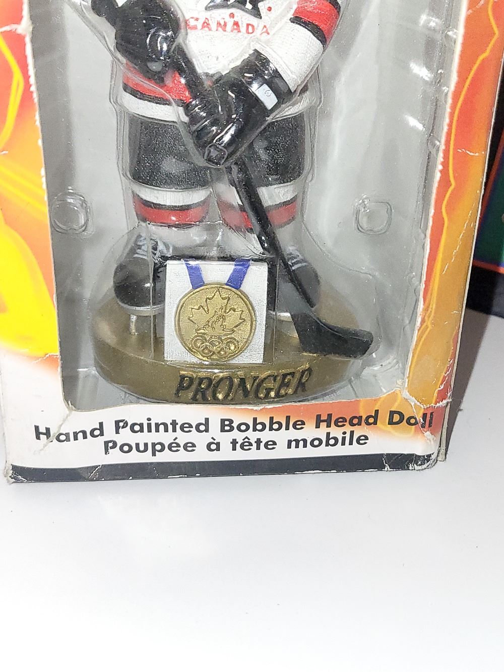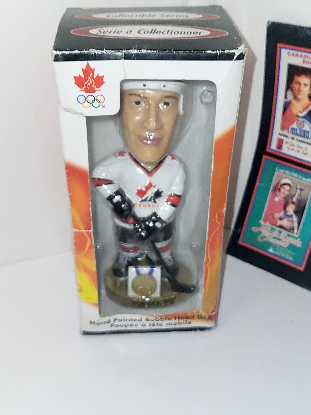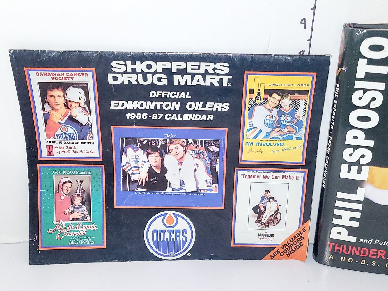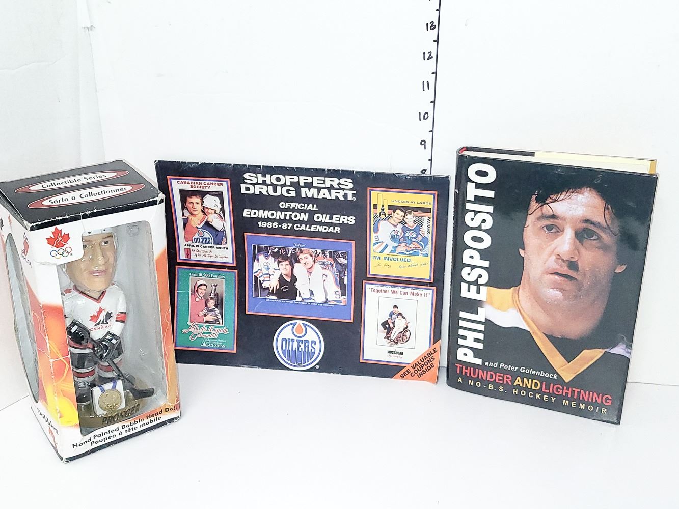 LOT OF 3 HOCKEY COLLECTIBLES. PHIL ESPOSITO BOOK, EDMONTON OILER 86-87 CALENDAR AND RPONGER OLYMPIC BOBBLE HEAD (HEAVY)