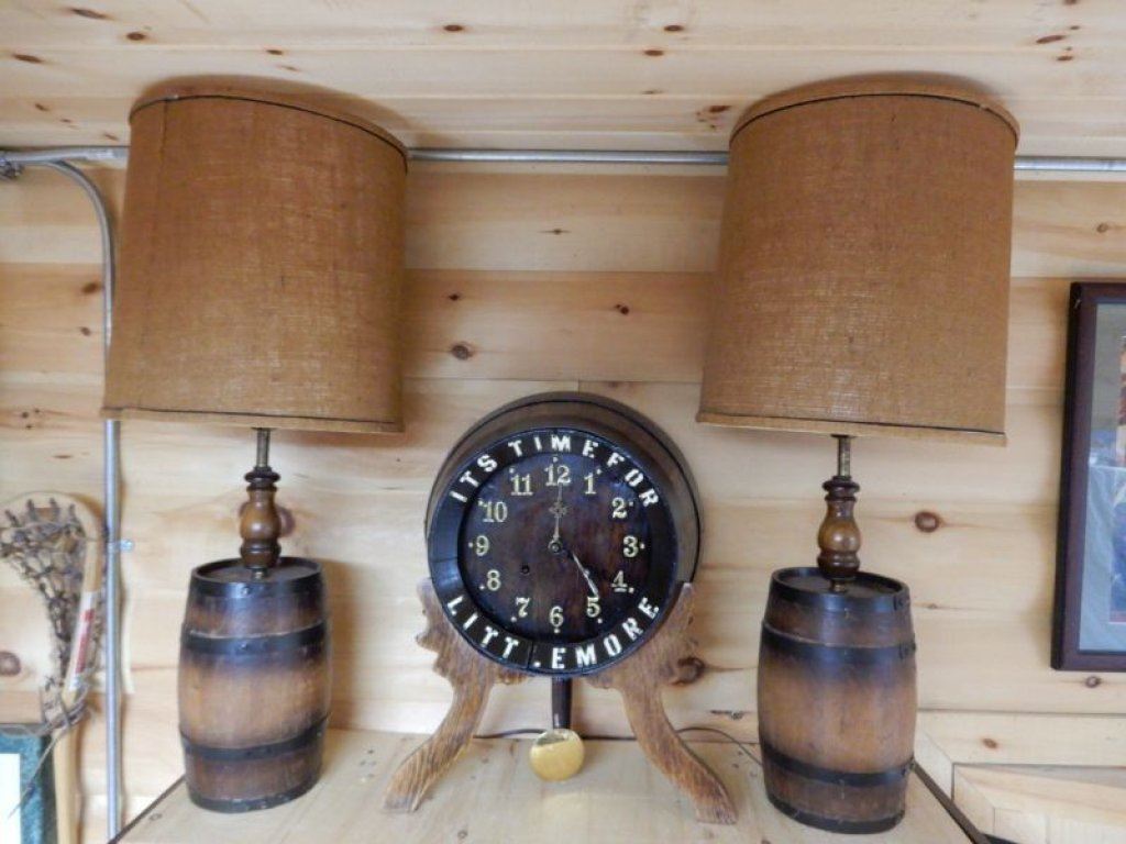 LOT OF 3 HOME ACCESORIES 2 BARREL LAMPS BARREL CLOCK WITH KEY LOCATION: UPPER OFFICE