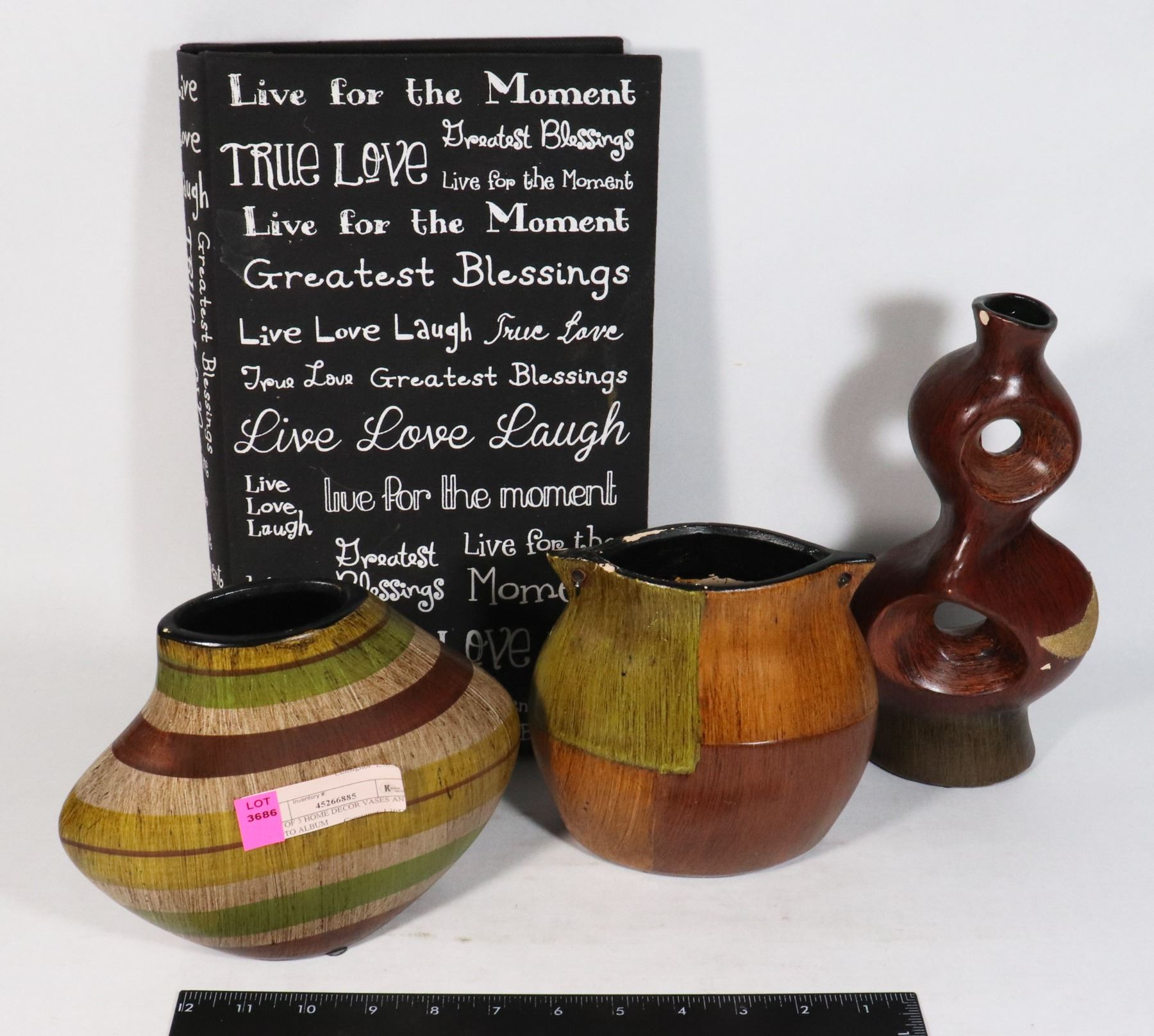 LOT OF 3 HOME DECOR VASES AND PHOTO ALBUM