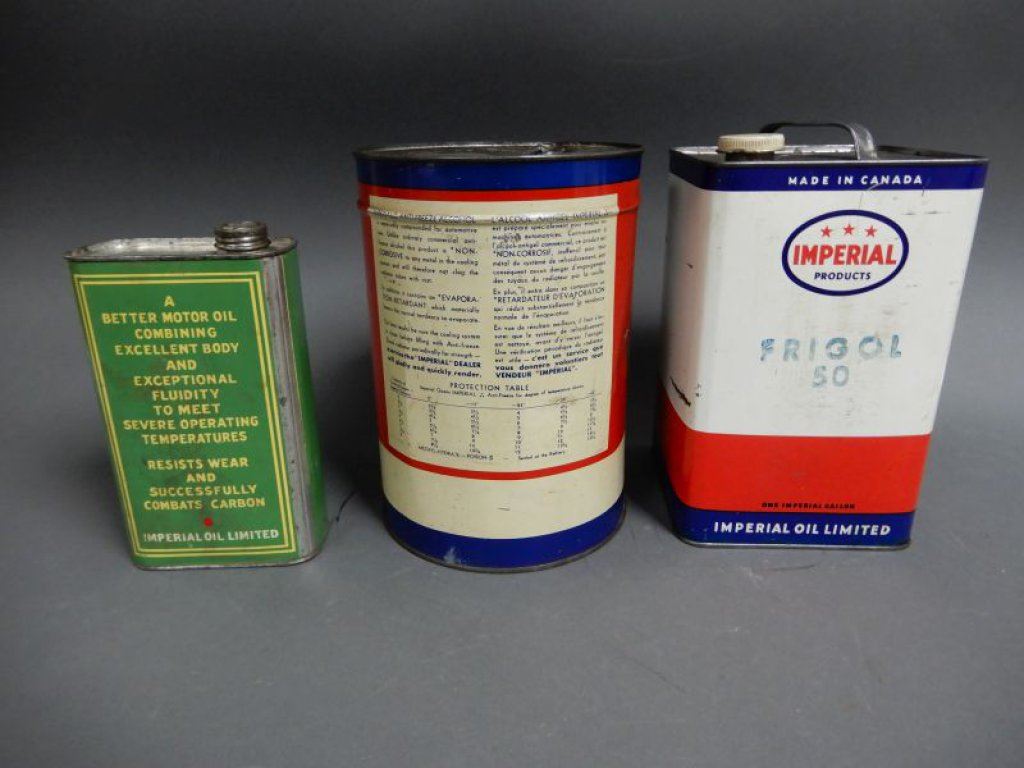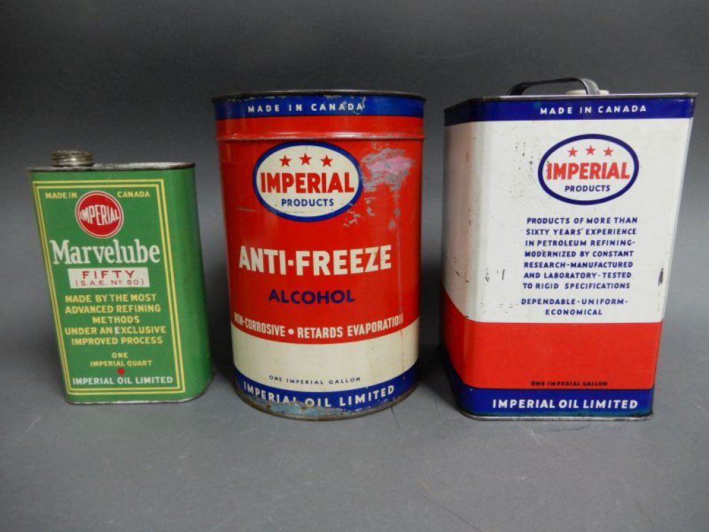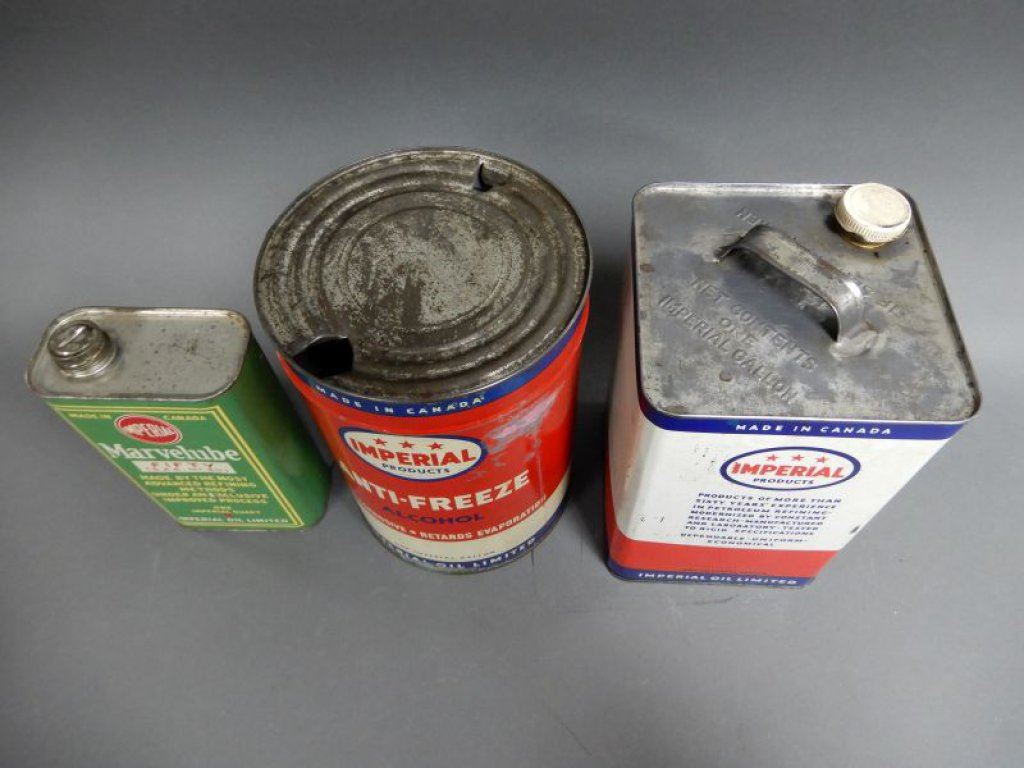 LOT OF 3 IMPERIAL CANS IMPERIAL MARVELUBE IMP QT WITH CORRECT CAP - IMPERIAL 3 STAR IMP GALLON CAN WITH EMBOSSED TOP & CORRECT CAP - IMPERIAL 3 STAR ANTI-FREEZE IMP GALLON - SOME WEAR LOCATION: LOWER LEFT