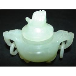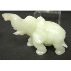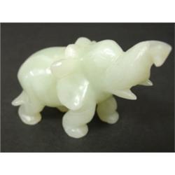 Pair of jadeite elephant figurines & jadeite covered lantern. Elephants are 2.5" H and covered lantern measures 2.25" H.