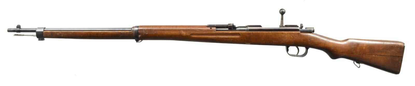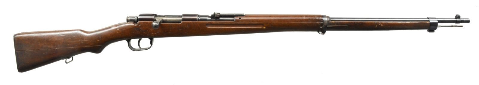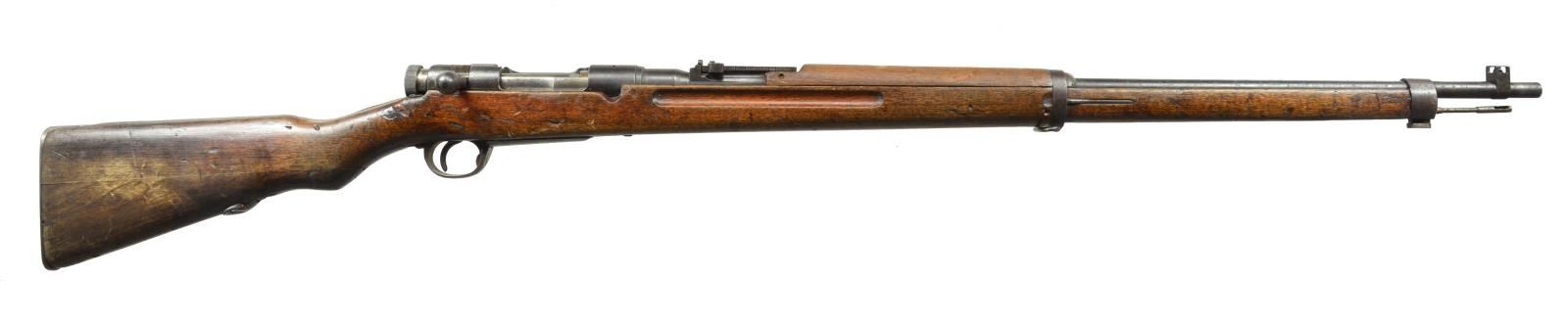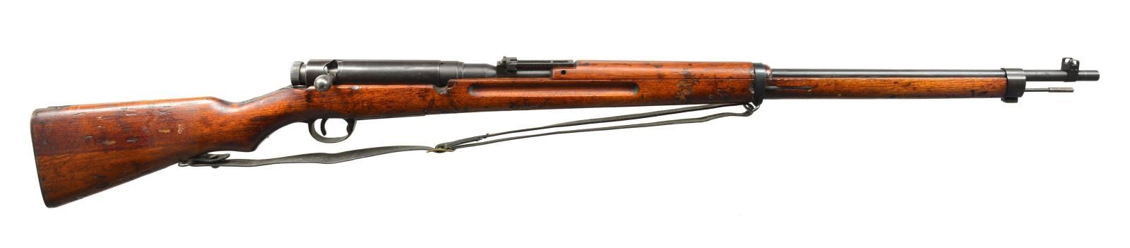 INCLUDING SCARCE TYPE I. 1) SCARCE TYPE I ITALIAN CONTRACT RIFLE. Cal. 6.5 Jap. S# F411. Bbl. 30 3/4". Rifles were mfg. in Italy under contract to the Imperial Japanese Navy. Rifles were made to approx. dimensions & features of the type 38 Japanese rifle, including the staggered mag., but using Carcano actions. Buttstocks were 2 piece construction. Receiver is unmarked. Bolt has diamond 45 acceptance mark under handle. Bolt has straight handle w/ round knob. Bbl. is marked on left side of chamber w/ S#. Ladder rear sight graduated to 2400m. Inverted V front sight. Cleaning rod is present. Bottom sling swivels. Hardwood stock set has Japanese type 2 piece construction. Smooth, flat buttplate. CONDITION: stock set has moderate wear, dents & scratches throughout. Buttstock joint is notably separated on both sides but is not loose. Metal has 75% original blue finish w/ light wear & handling marks. Bolt shows fading & case colors. Shiny bore appears to be rifled w/ Japanese type rifling. (20-2274/RW). CURIO. 2) TYPE 38. Cal. 6.5 Jap. S# 60924. Bbl. 31". Numbers match on receiver & bayonet lug. Receiver marked on left rail w/ Nagoya Arsenal marking. Receiver ring has intact mum & “Type 38” Japanese characters. Straight bolt handle w/ oval knob. Lg. tang checkered safety knob. Ladder rear sight graduated to 2400m. Inverted V front sight w/ protective ears. 29 1/2” Cleaning rod. Hardwood stock set. Buttstock has 2 piece construction. CONDITION: stock has heavily worn original finish w/ dents, scratches & staining throughout. Notable loss of wood in toe area. Metal has traces of blue turning gray & patina w/ wear, oxidation & scattered areas of fine pitting. Shiny bore w/ lightly worn lands. (20-2275/RW). CURIO. 3) JAPANESE TYPE 38 MILITARY RIFLE. Cal. 6.5 Jap. S# 60608. Bbl. 31”. Nonmatching S#. Receiver is marked on left side w/ interlocking circles indicating mfg. at Koshikawa Arsenal. Receiver has intact mum & “Type 38” characters. Straight bolt handle w/ oval knob. Checkered lg. tang safety knob. Correct style original dust cover. Ladder rear sight graduated to 2400m. Inverted V front sight w/ protective ears. 29 1/2" Cleaning rod. Bottom swivels w/ vintage 1" leather sling. Hardwood stock set w/ 2 piece buttstock construction. CONDITION: stock set has worn original finish w/ extensive dents & scratches. Many dents have been repaired likely by armorer w/ filler. Notable denting on left side over mag. well & right side between receiver ring & lower band. Metal retains 60% original blue finish, turning gray w/ thinning & wear. Fair, worn bore turning dark in grooves. (20-2276/RW). CURIO. $1,000-1,400.