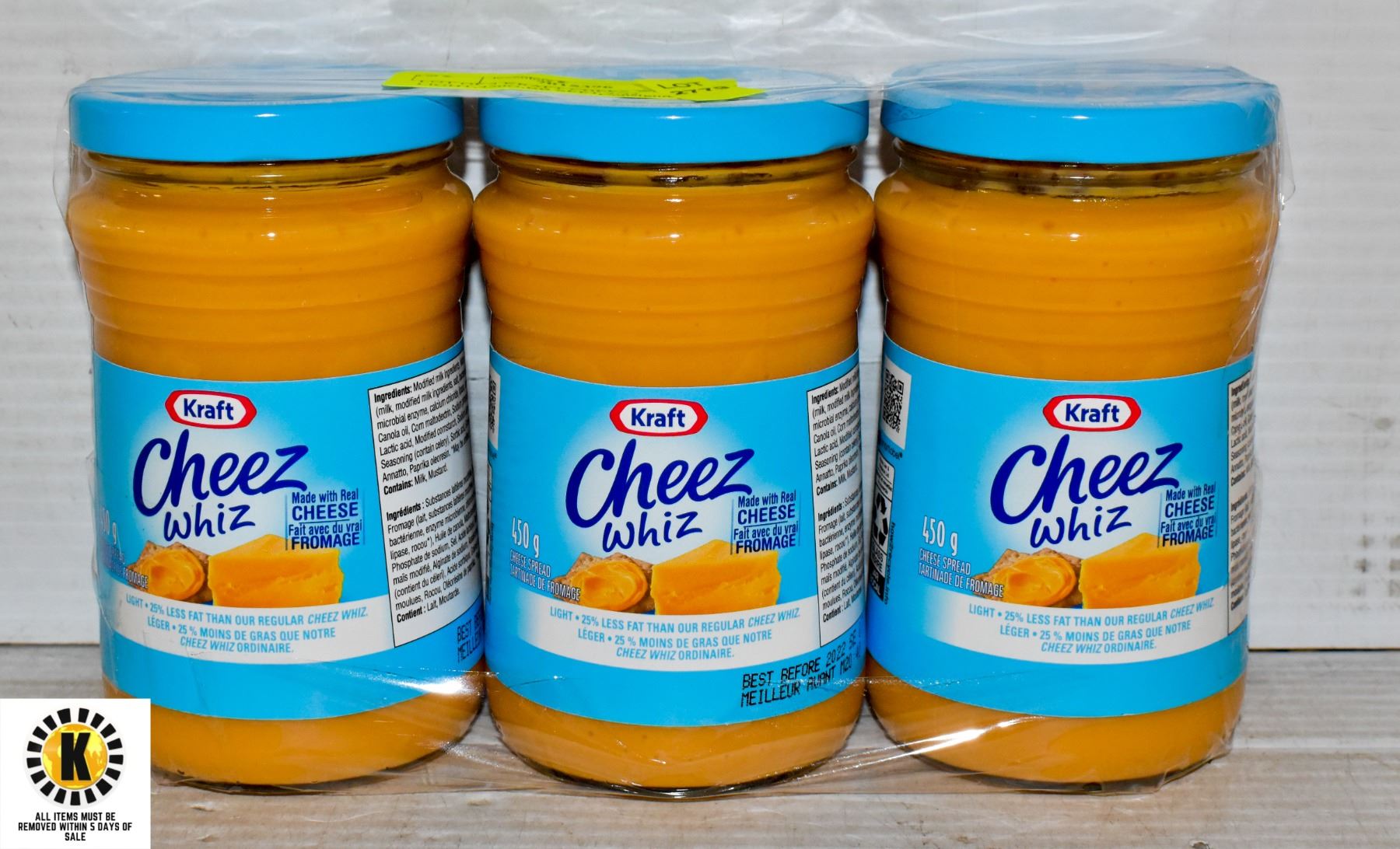 LOT OF 3 KRAFT CHEEZ WHIZ LIGHT,450G,BB SEPT 7/22