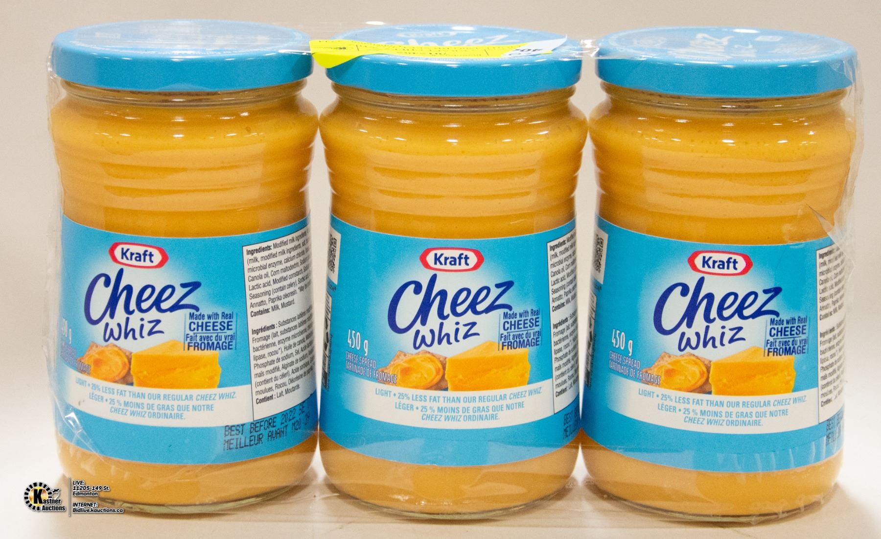LOT OF 3 KRAFT CHEEZ WHIZ LIGHT,450G,BB SEPT 7/22