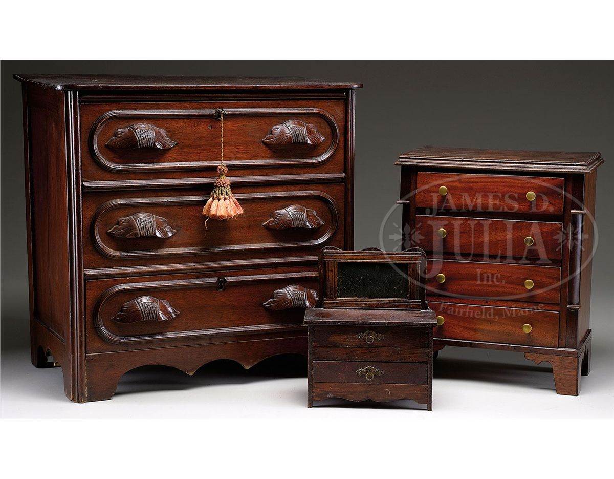 Lot includes three wonderful Victorian era dressers consisting of 1) Mahogany three drawer dresser with carved pulls depicting stylized flags and leaves. Each dovetailed drawer locks with accompanying key. 2) Four drawer dresser with brass pulls. 3) Two drawer mirrored dresser with fancy ormolu ring pulls. SIZE: Largest 21-1/2" l x 20-1/2" h x 12-1/2" d. CONDITION: First two are very good to excellent with first having slight seam separation to skirt, third piece is good to very good with dulling to mirrored finish. 1-13386