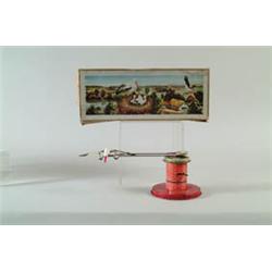Lot # 1262 LOT OF 3 MISC. TOYS W/OB. 1) French fishing game. Electric toy vibrates fishing pond. Poles included. 2) Highway road set by Ohio Art, Western Germany. Two windup cars travel over highway system. 3) Tin/Plastic windup flying stork. Western Germany. Stork circles tower with flapping wings or gliding action. SIZE: Largest box is 19" l. CONDITION: Very good and working. Boxes are fair to good. 1-29406 (250-400)