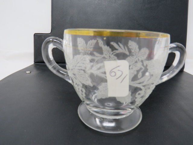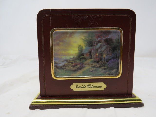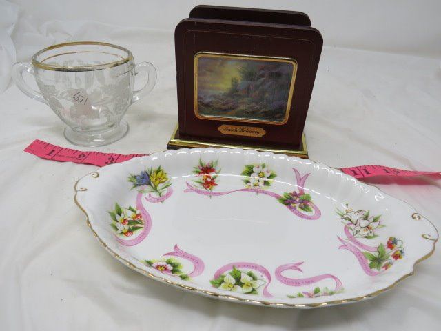 LOT OF 3 (NAPKIN HOLDER - THOMAS KINKADE; SERVING DISH - ROYAL ALBERT; GLASS SUGAR BOWL)