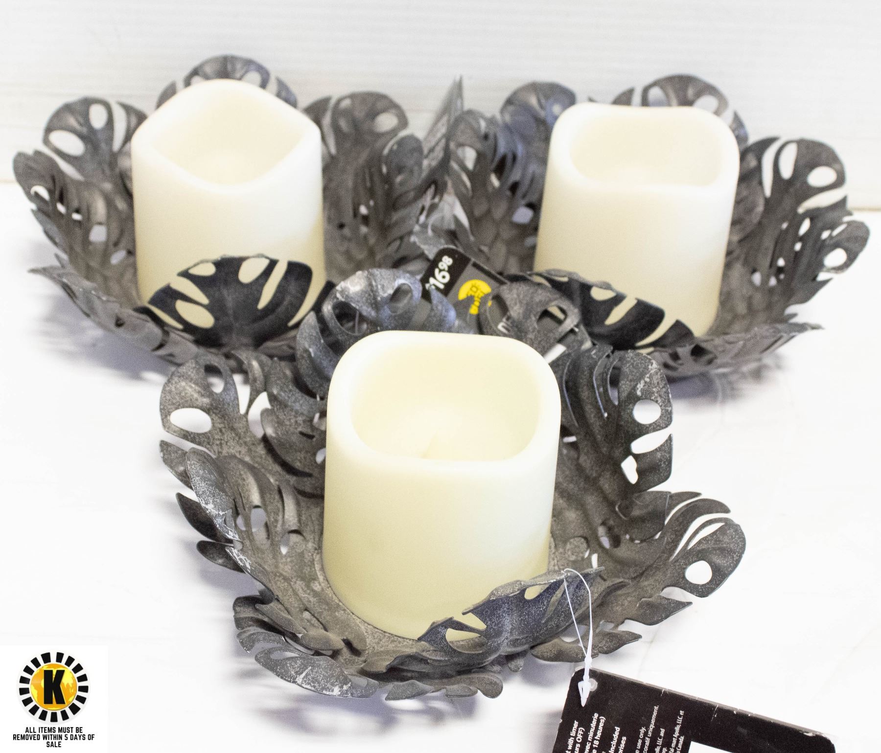 LOT OF 3 NEW METAL LEAF LED CANDLE CENTERPIECE