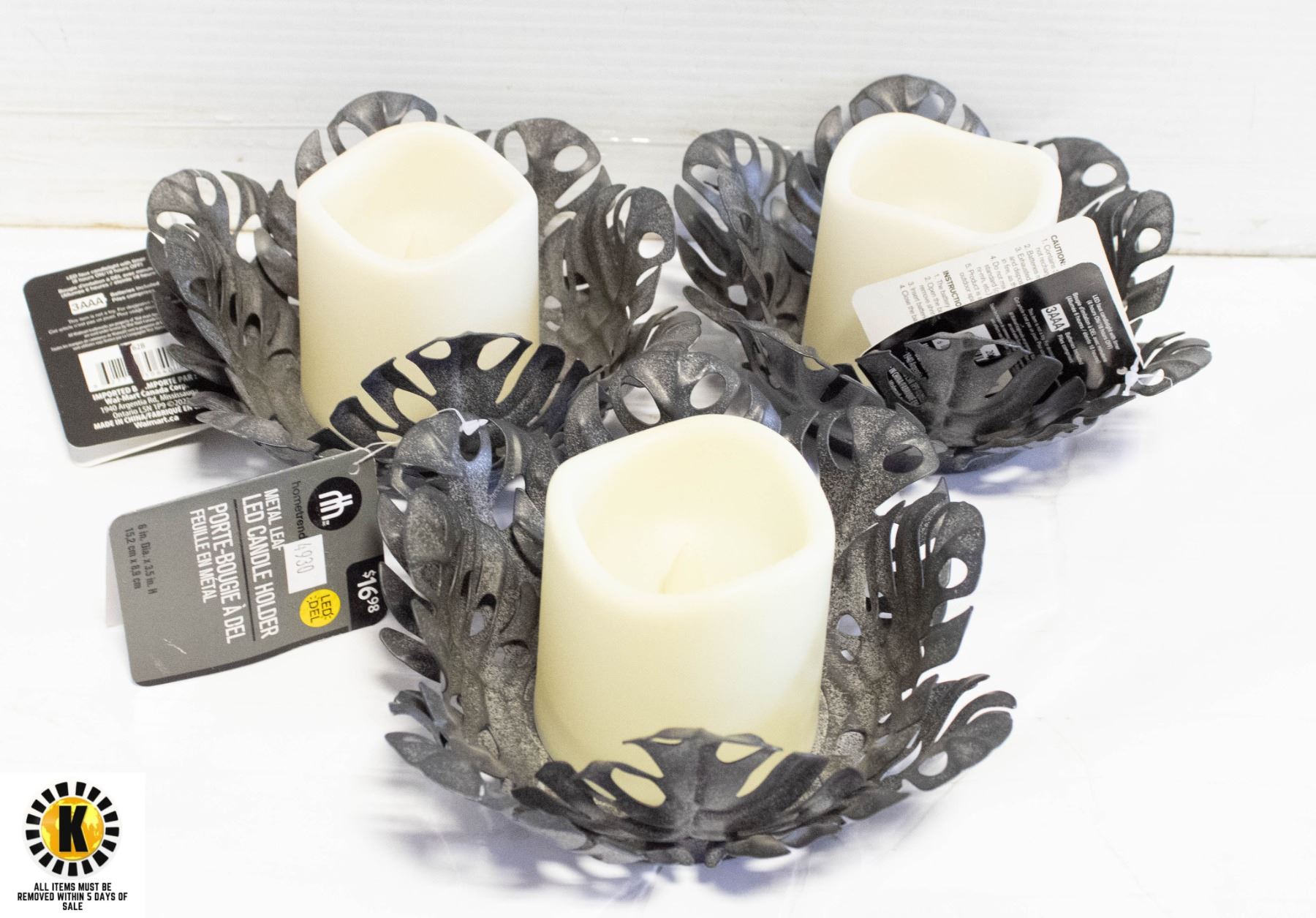 LOT OF 3 NEW METAL LEAF LED CANDLE CENTERPIECE