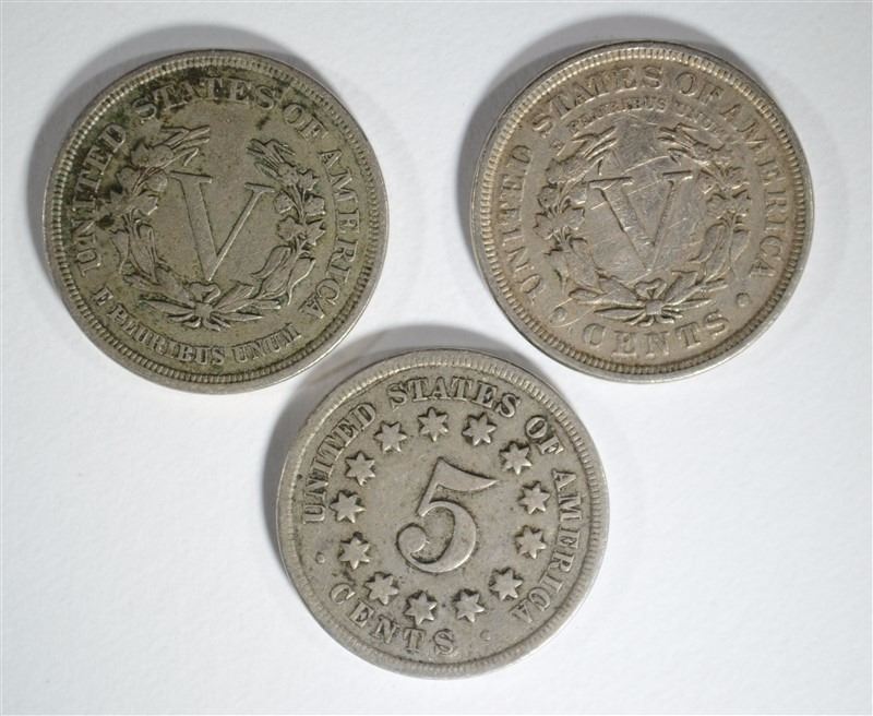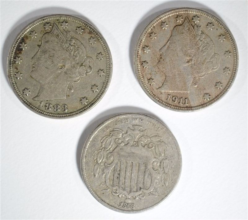 1868 SHIELD NICKEL, F/VF 1883 NO CENTS & 1911 LIBERTY NICKELS, BOTH XF ESTIMATE $65 - $75.