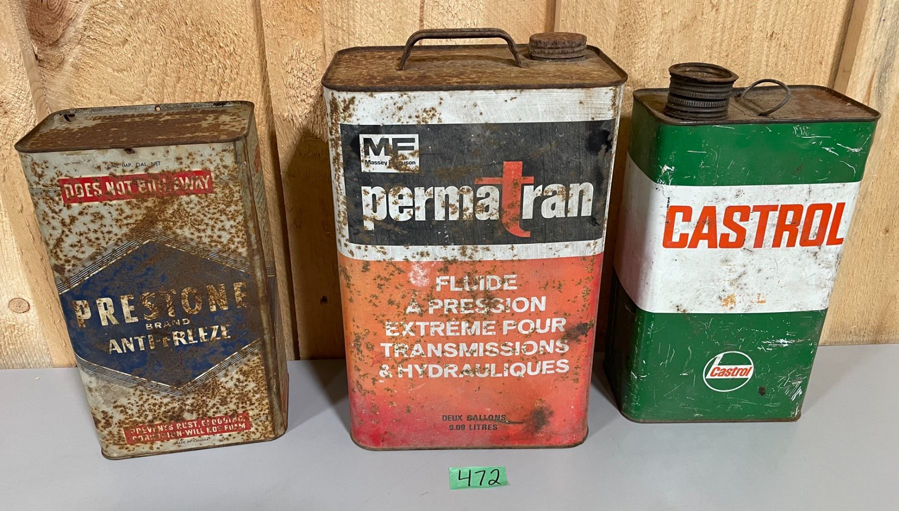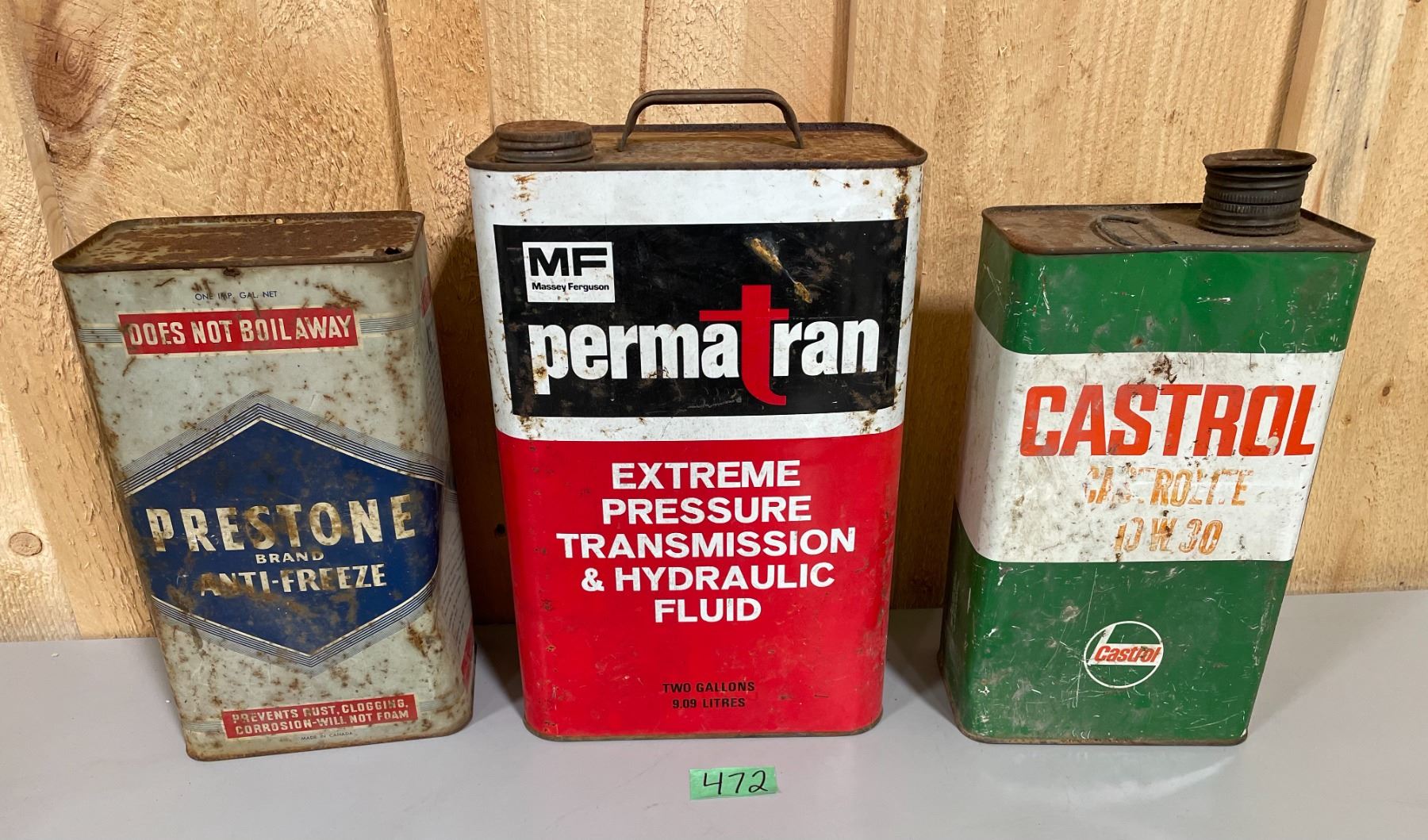 LOT OF 3 OIL CANS - MF 2 GAL. CASTROL & PRESTONE 1 GAL