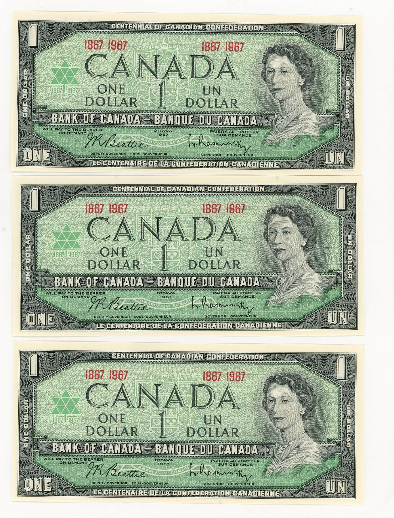 LOT OF 3 ONE DOLLAR BILLS (CENTENNIAL) *CANADA* (1867-1967)