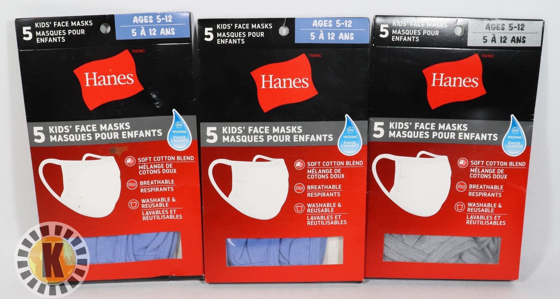 LOT OF 3 PACKAGES OF HANES KIDS FACE MASKS 5-12
