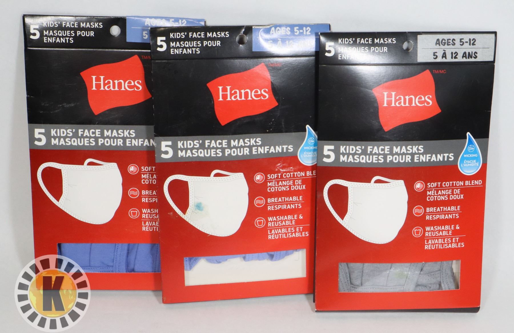 LOT OF 3 PACKAGES OF HANES KIDS FACE MASKS 5-12