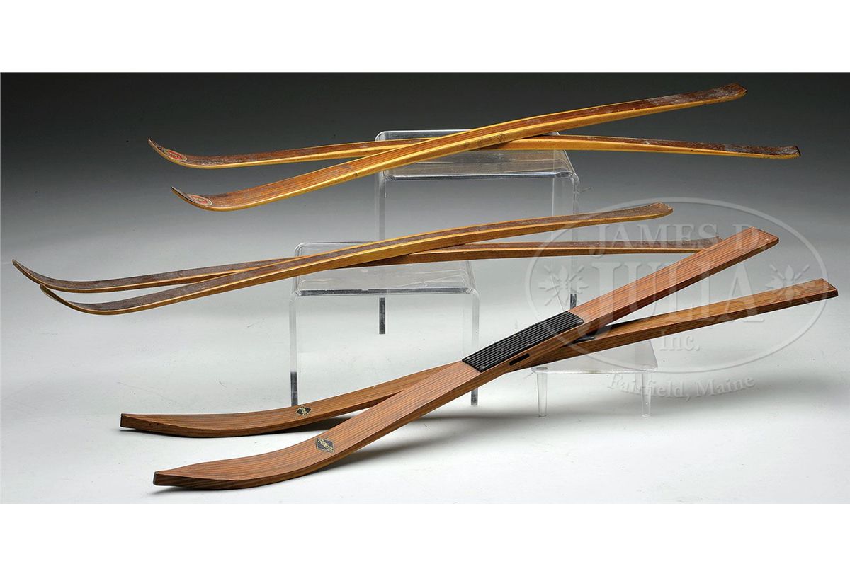 Lot includes two pairs of two tone wooden snow skis by Ostbye of Norway which are stamped on the bottom with the company logo and similar style decals on top. Also includes a pair of Oxford skis with rubber foot pads and Oxford decals. SIZE: Approximately 25" l. CONDITION: Very good to excellent with wear to decals. Oxford skis missing straps. 1-13607
