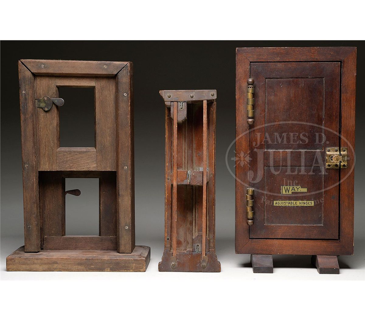 Lot includes partial cutaway of a window sash stamped "Athey Co.", wood frame window in which both halves have a finger latch that locks them into position, as well as a salesman sample door frame with original decals identifying the "Way" adjustable hinges (missing one hinge pin). SIZE: Largest 15" h x 8" w. PROVENANCE: The late Terry Wesner collection, Chelsea, Michigan. CONDITION: Good to very good with scattered chips to finish. 1-13509