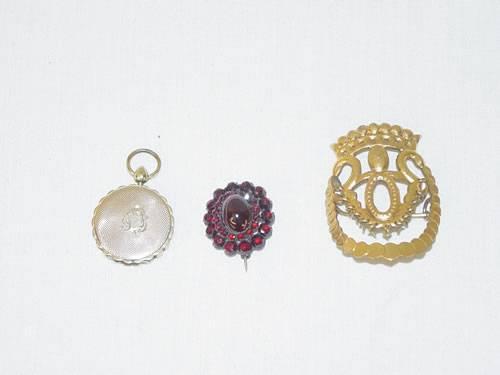 LOT OF (3) PCS. OF VINTAGE COSTUME JEWELRY - COSTUME PIN W/ CROWN TOP, RED STONE COSTUME PIN, and GOLD FILLED LOCKET;