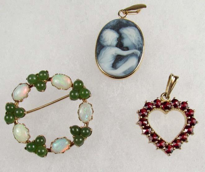 LOT OF 3 PIECES OF FINE JEWELRY W/ GOLD AND PRECIOUS STONES - 14K Gold Mother and Child Cameo pendant, 22K Gold w/ 16 Rubies heart shaped pendant w/ English mark on the bail and 14K Jade and Opal brooch.