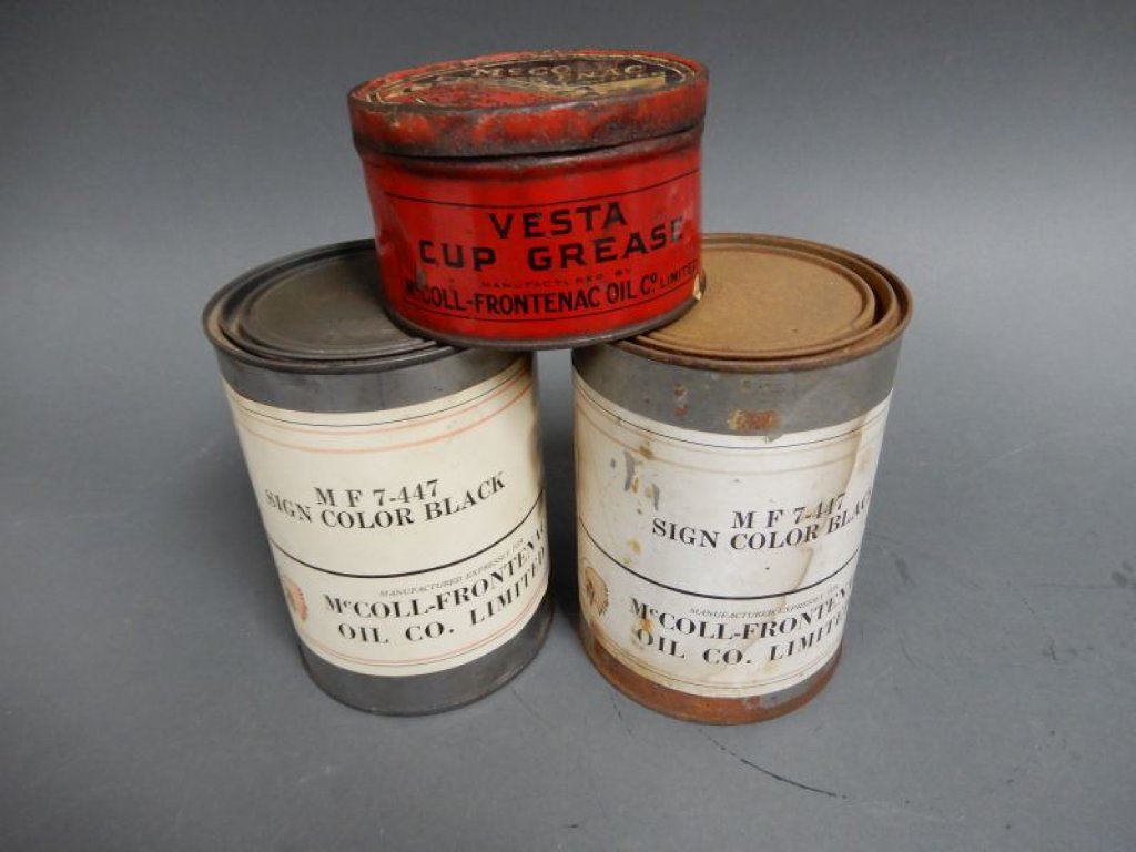 LOT OF 3 RED INDIAN CANS 2 FULL QT CANS OF BLACK PAINT WITH PAPER LABELS - VESTA CUP GREASE CAN LOCATION: LOWER RIGHT