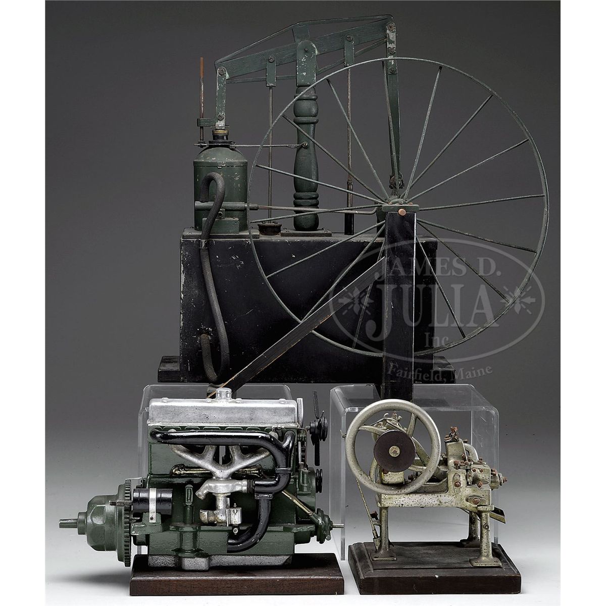 Lot includes 1) Internal combustion engine. 2) Nickel plated cutting machine on wooden base. 3) Wood and metal steam engine with locking beam and large flywheel. SIZE: Largest: 21" l x 22" h x 10" d. CONDITION: Generally good with various chips, scratches and dulling to finish. 1-13567