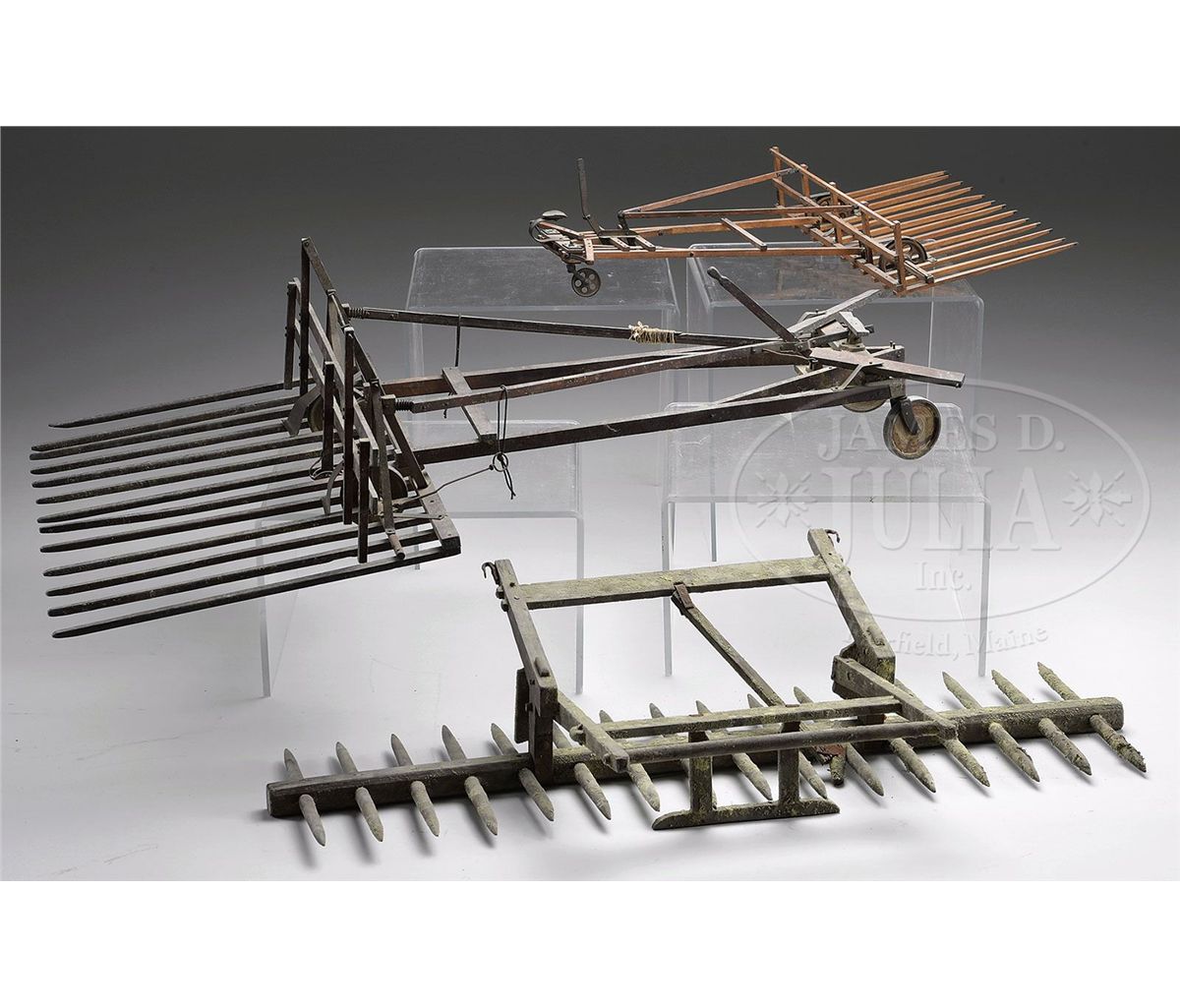Lot includes two similarly styled wood models with long tines operated by hand lever in front of the formed saddle seat resting on brass wheels and hardware. Lot also includes one additional piece. SIZE: Largest 30" l x 18" w. CONDITION: Overall good to very good. Smaller hay loader missing one brass wheel while larger loader has amateurish repair. 1-13541