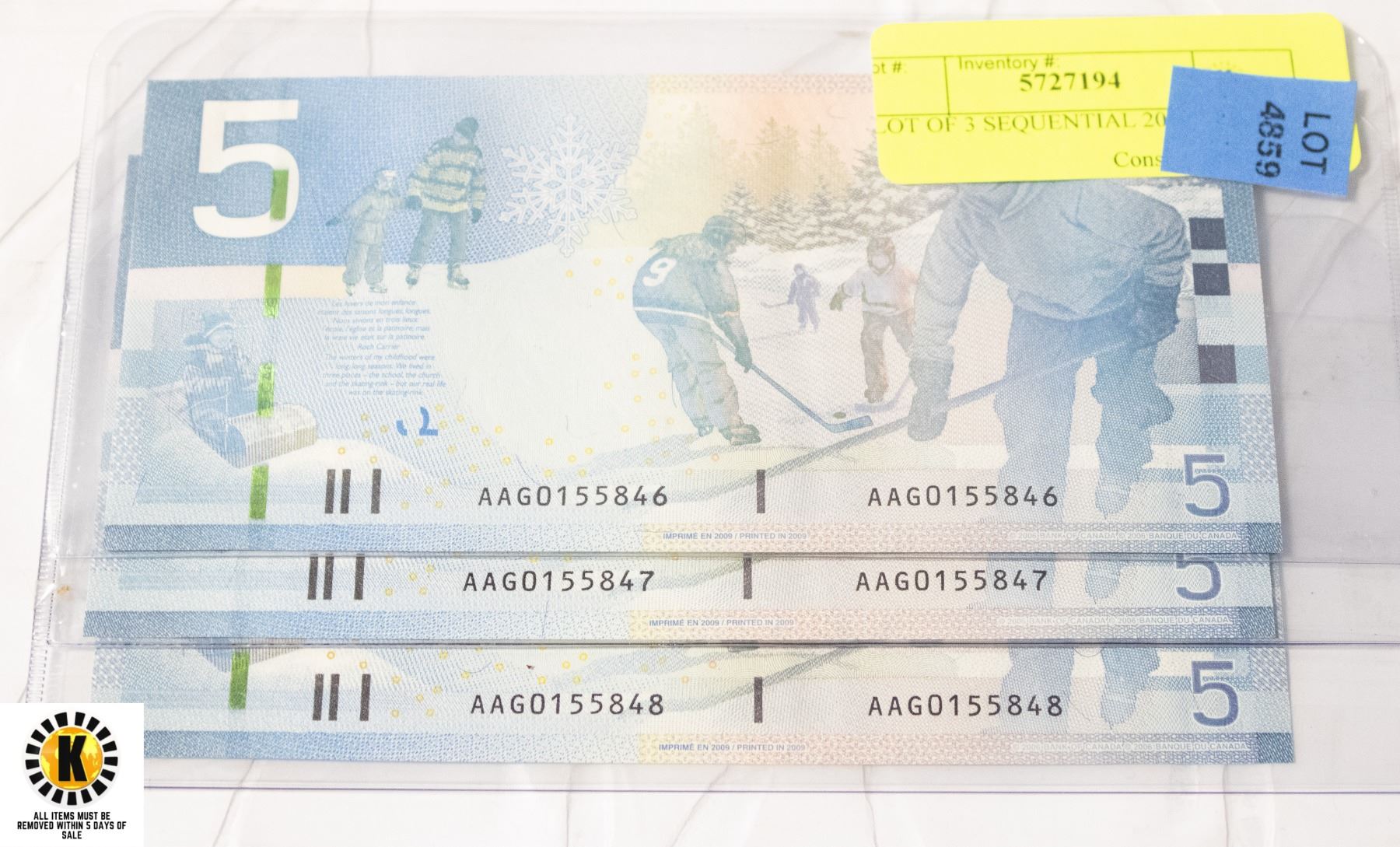 LOT OF 3 SEQUENTIAL 2009 $5 BILLS
