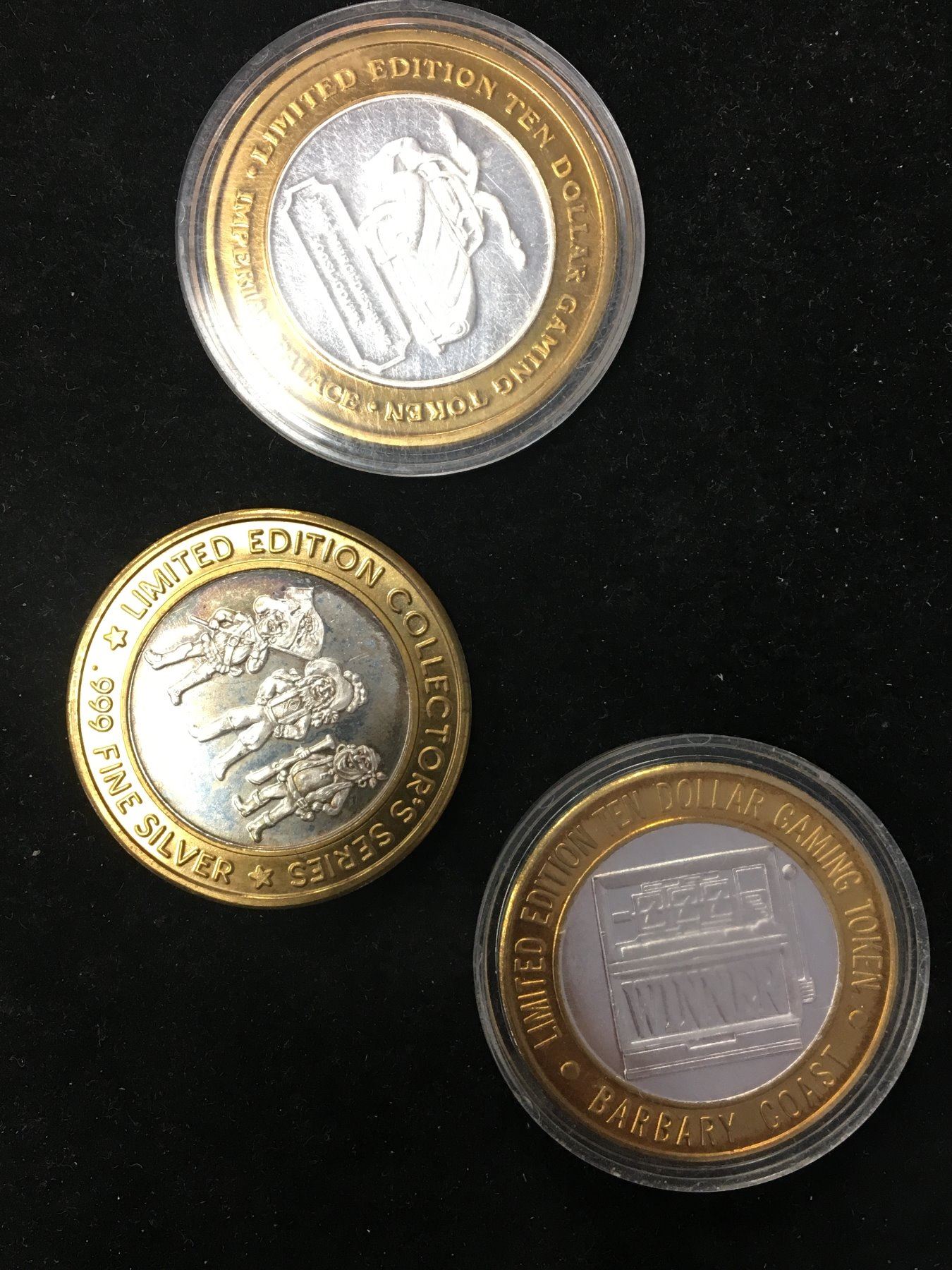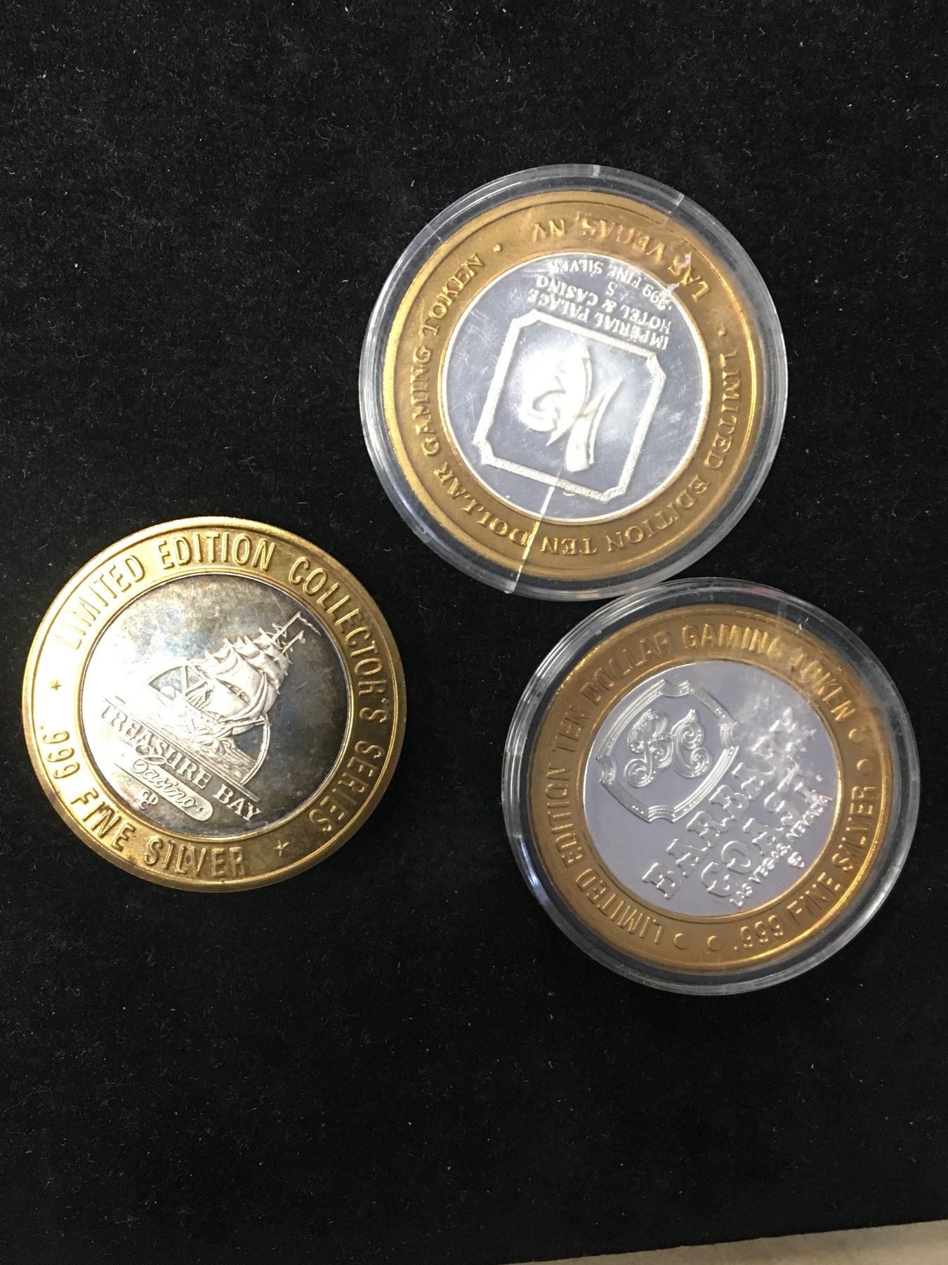 NICE LOT OF 3 LIMITED EDITION TOKENS…TREASURE BAY CASINO.999 FINE SILVER..BARBARY COAST TEN DOLLAR GAMING TOKEN.999 FINE SILVER AND IMPERIAL PALACE TEN DOLLAR LIMITED EDITION GAMING TOKEN.999 FINE SILVER.