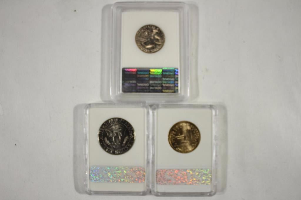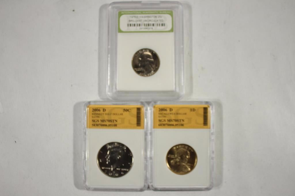 1976-D WASHINGTON QUARTER BRILLIANT UNC, 2006-D KENNEDY HALF DOLLAR MS SATIN FINISH AND 2006-D SACAGAWEA DOLLAR MS SATIN FINISH