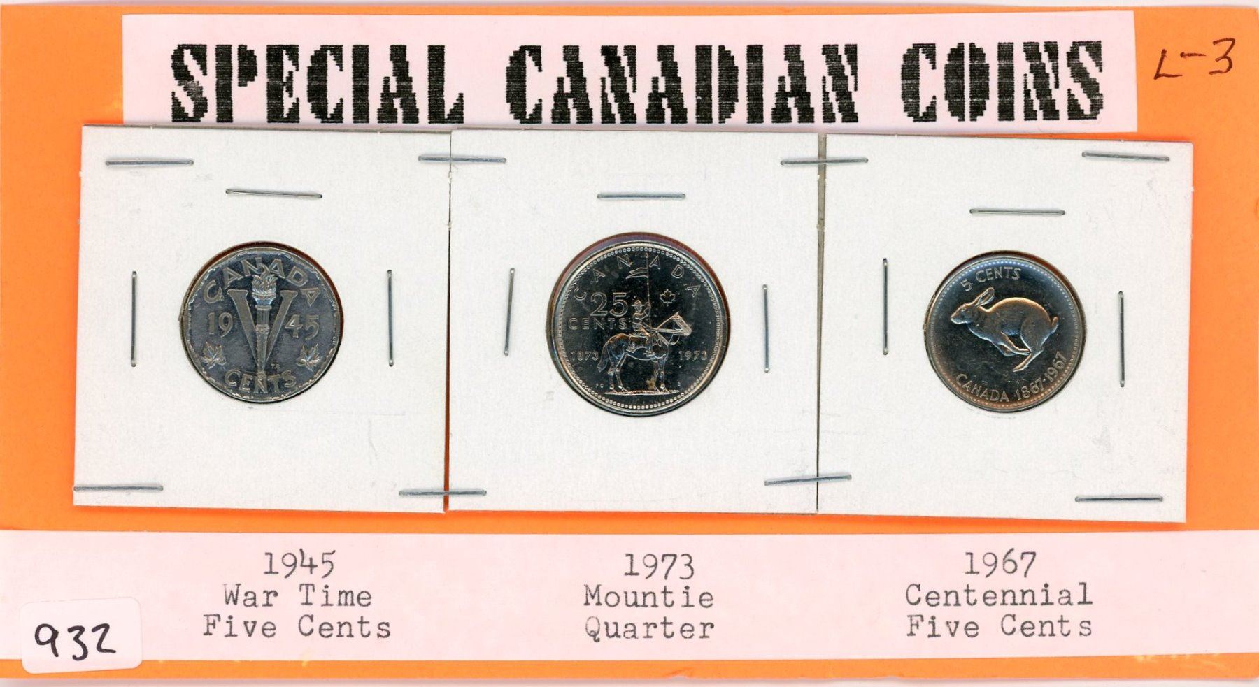 LOT OF 3 SPECIAL CANADIAN COINS (1945 WAR TIMES NICKLE, 1973 RCMP QUARTER, 1967 CENTENNIAL NICKLE)