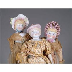 LOT OF 3 STONE BISQUE DOLLS W/ MOLDED BONNETS. 15” finely detailed stone bisques with molded bonnets and cloth bodies, the first having parian arms and legs, the second having bisque arms and china legs. The third with molded bonnet and tam. First 2 dolls wearing period clothing, 3rd has replacement body and clothing of that vintage (1950’s?). CONDITION: Very good overall, one with hairline across shoulder plate. 1-2665