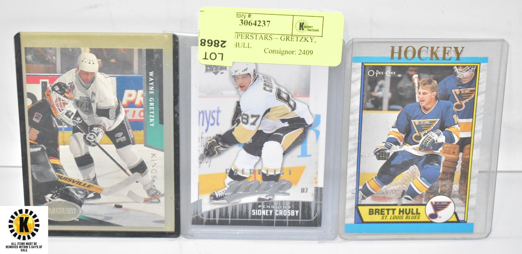 LOT OF 3 SUPERSTARS – GRETZKY, CROSBY & HULL
