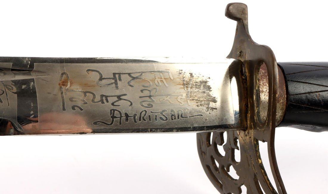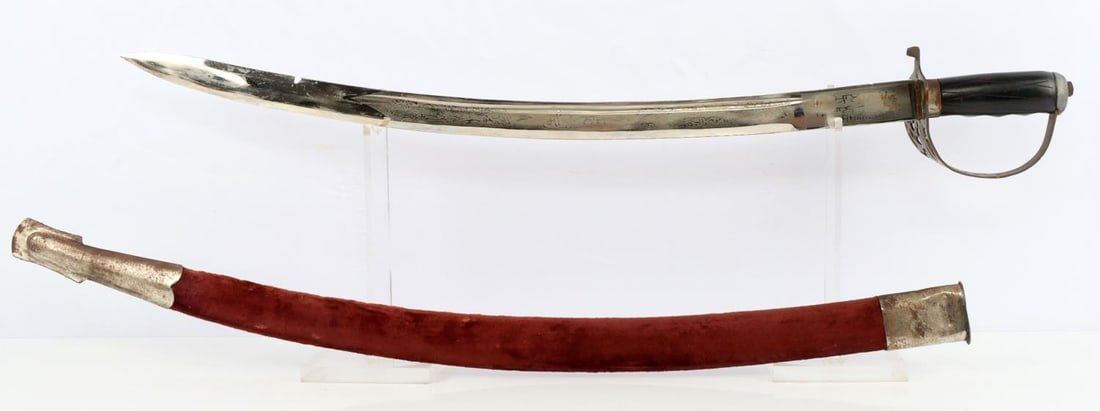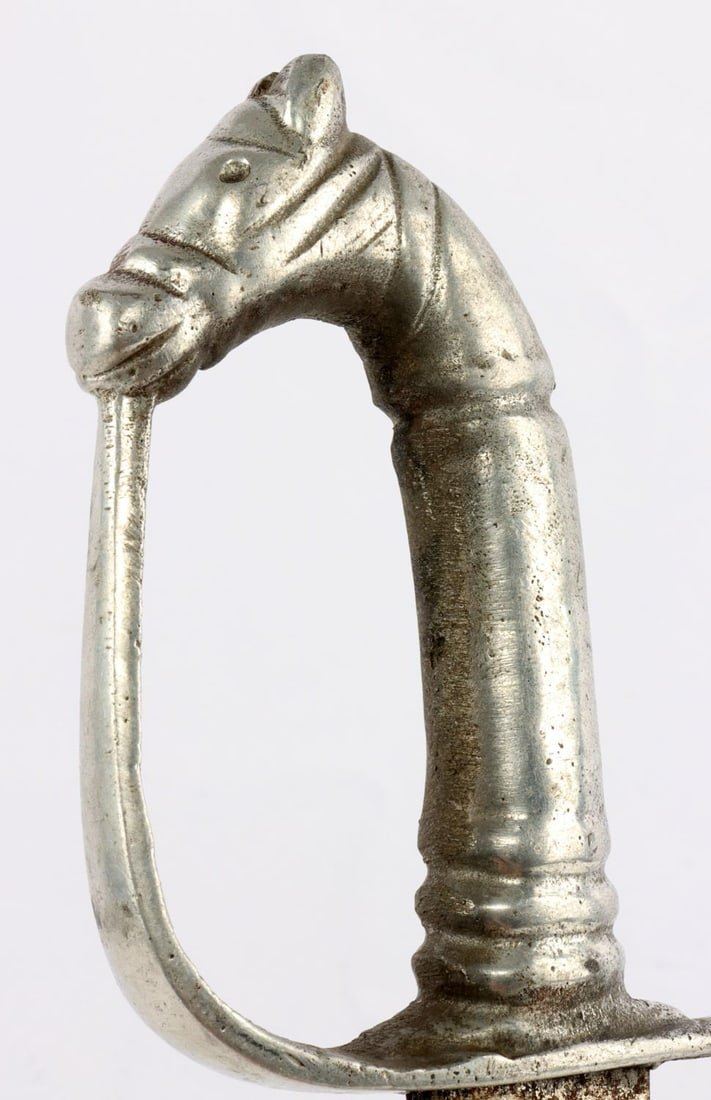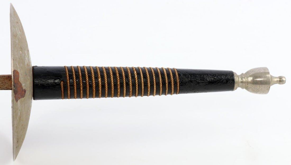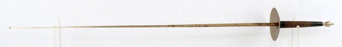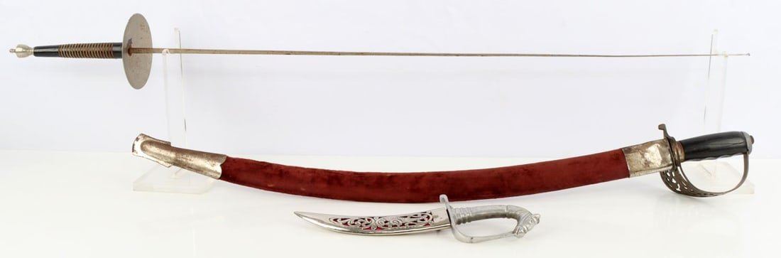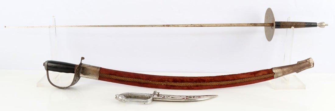 1 Fencing foil. Dimension: Some surface rust but over all very good condition. 1 Indian sword. Engraved on both sides of the blade, brass hand guard with a cloth wrapped scabbard in very good condition. 1 Horse head curved dagger and scabbard in very good condition. Overall length range 42-12 and blade range 25-6.5 in inches.