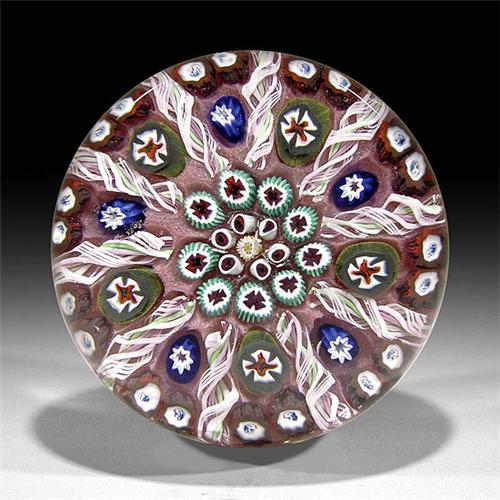 Strathearn Glass millefiori and latticinio spokes paperweight. A central off-white cross cane is encircled by a ring of red and white star canes, which is surrounded by a ring of blue, white, and red cross canes, and bordered by ten spaced latticinio spokes, dividing panels of assorted canes, on pink ground. Diameter 3 1/16".